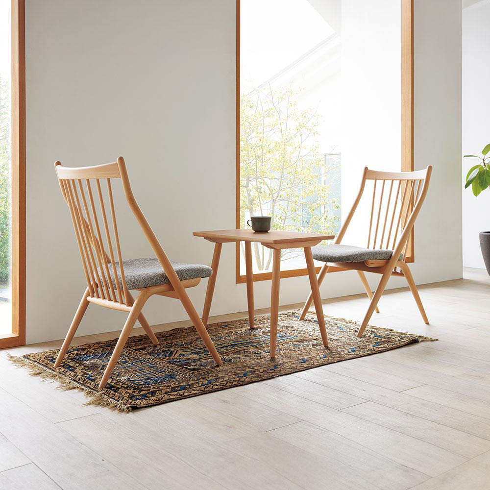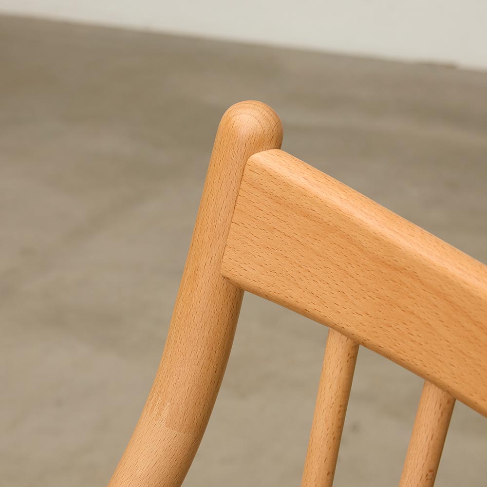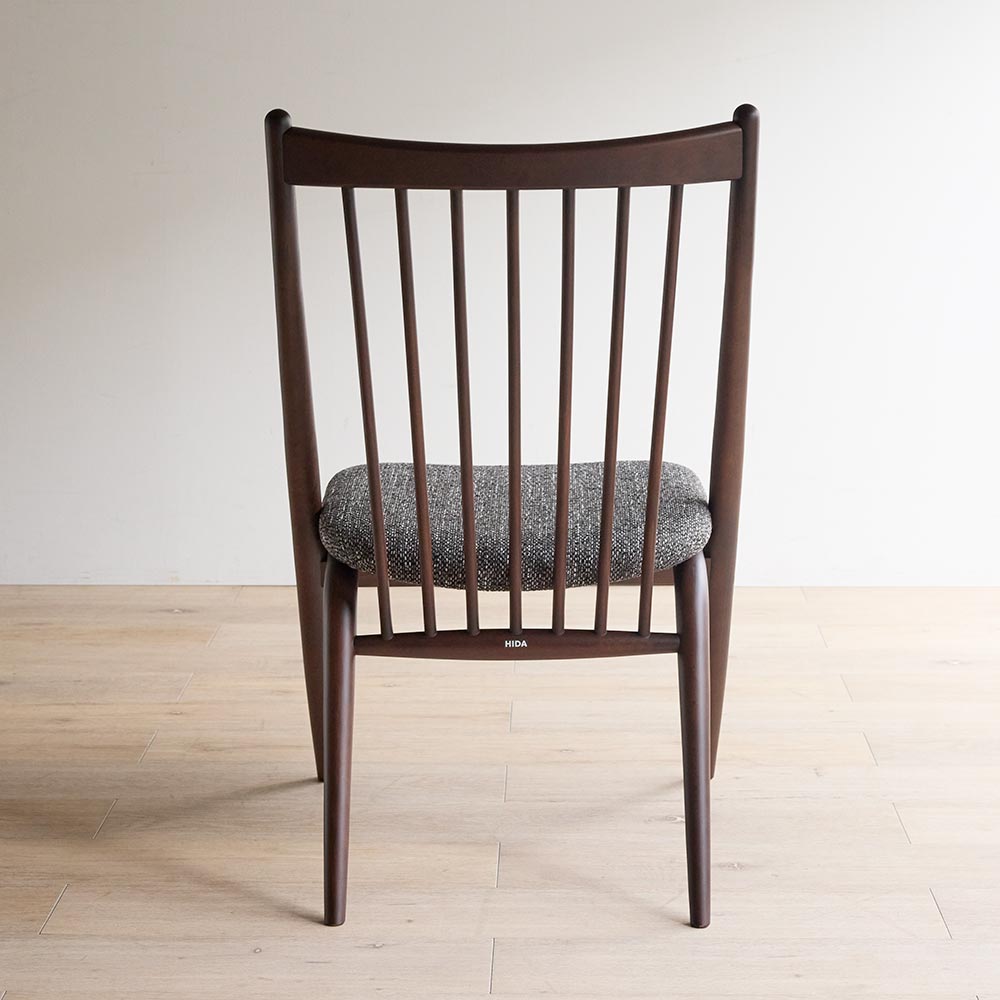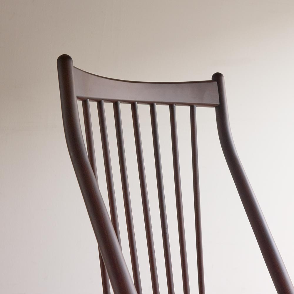 脚部、少しずつ細くなるシルエット、スポーク(部上の背もたれ)まで繊細に計算された美しい形状が魅力。スポーク状のチェアは世の中に多々ありますが、細い木材で上品に仕上げつつ、しっかりとした強度を持たせることができるのはきちんと技術継承された職人だからこそ実現できる形です。