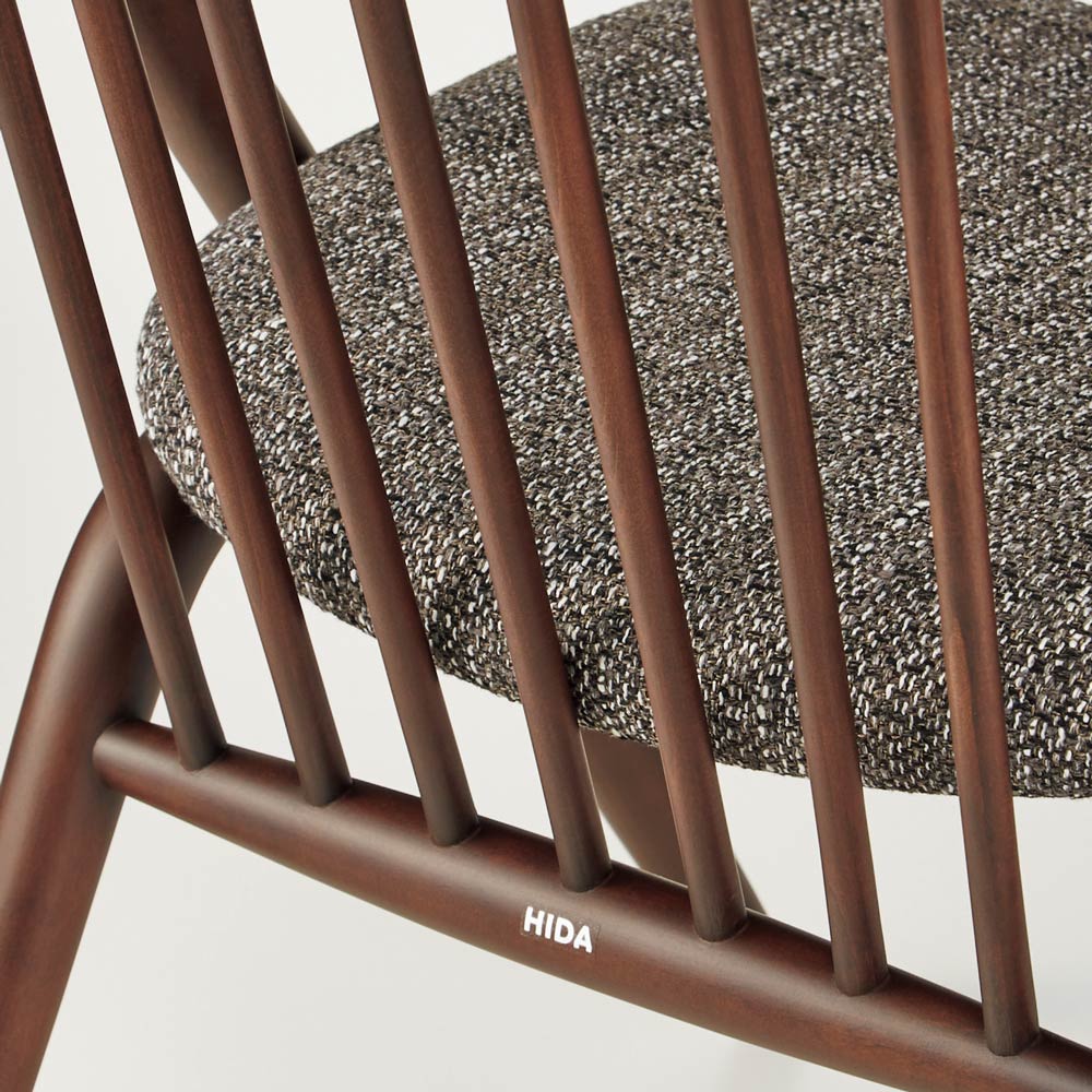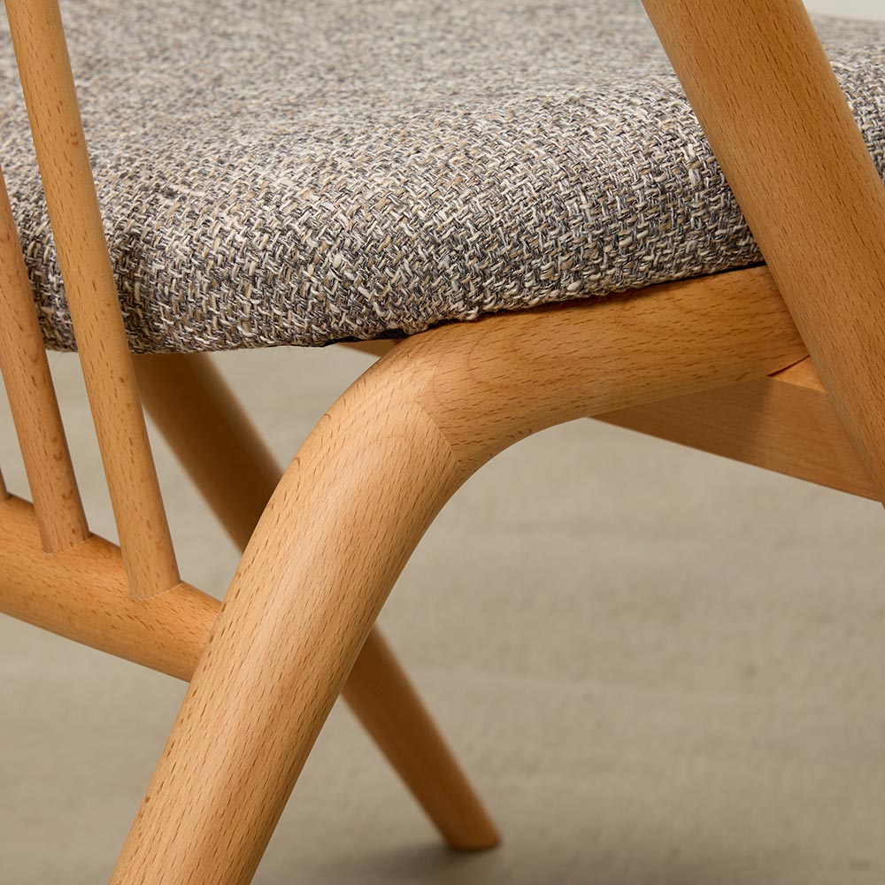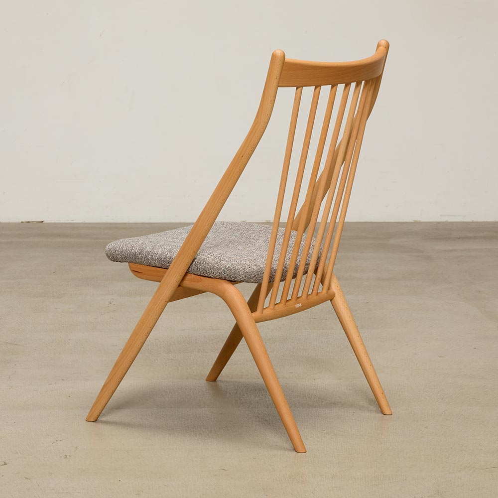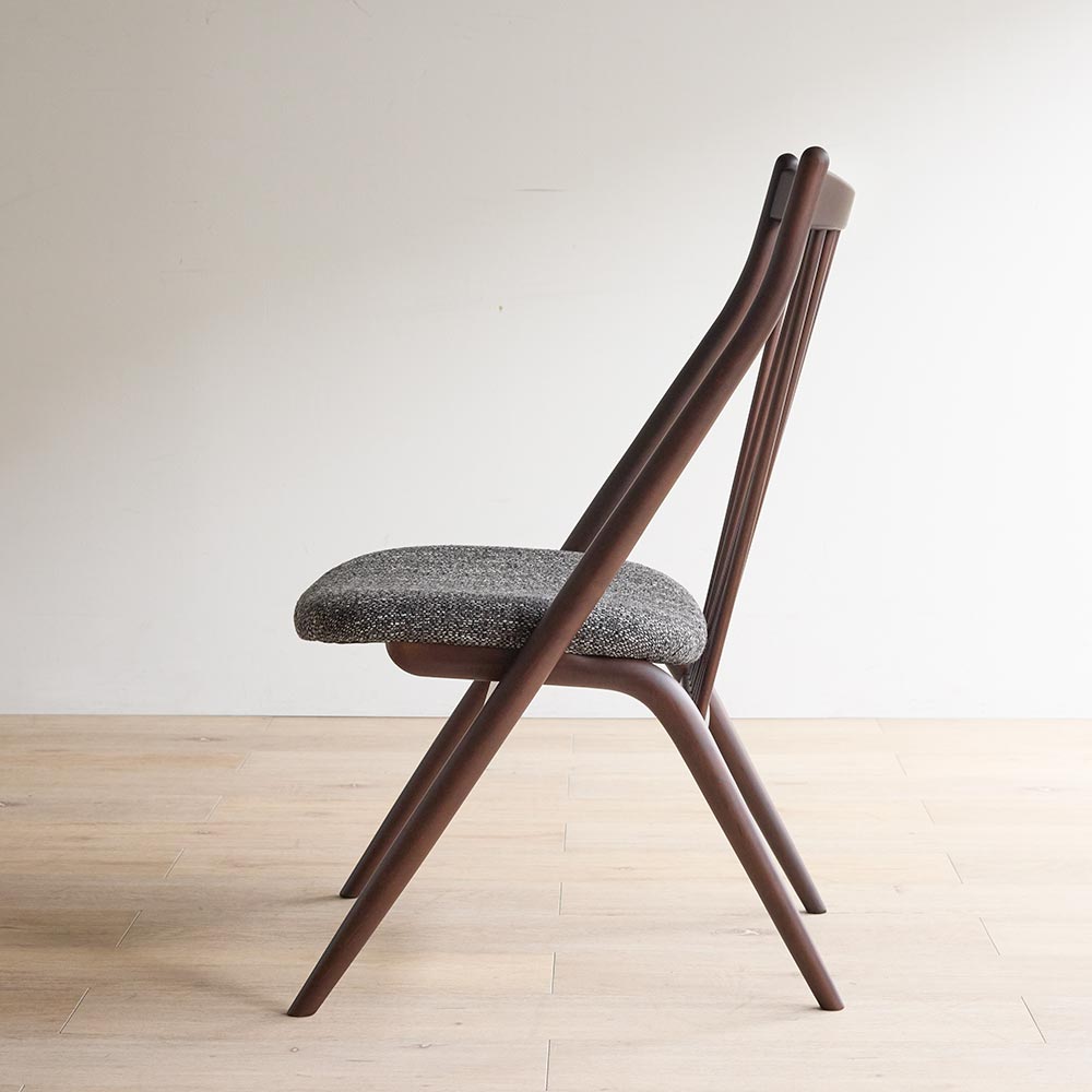 脚部、少しずつ細くなるシルエット、スポーク(部上の背もたれ)まで繊細に計算された美しい形状が魅力。スポーク状のチェアは世の中に多々ありますが、細い木材で上品に仕上げつつ、しっかりとした強度を持たせることができるのはきちんと技術継承された職人だからこそ実現できる形です。