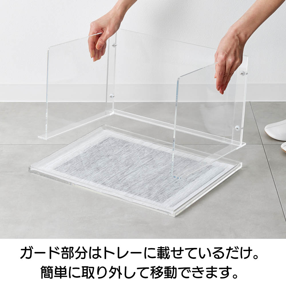 飛散ガードはトレーの上に載せるだけ。ガードの底面がペットシートのストッパーを兼ねる形です。簡単に取り外せるので、シートの交換や移動もラクラク。