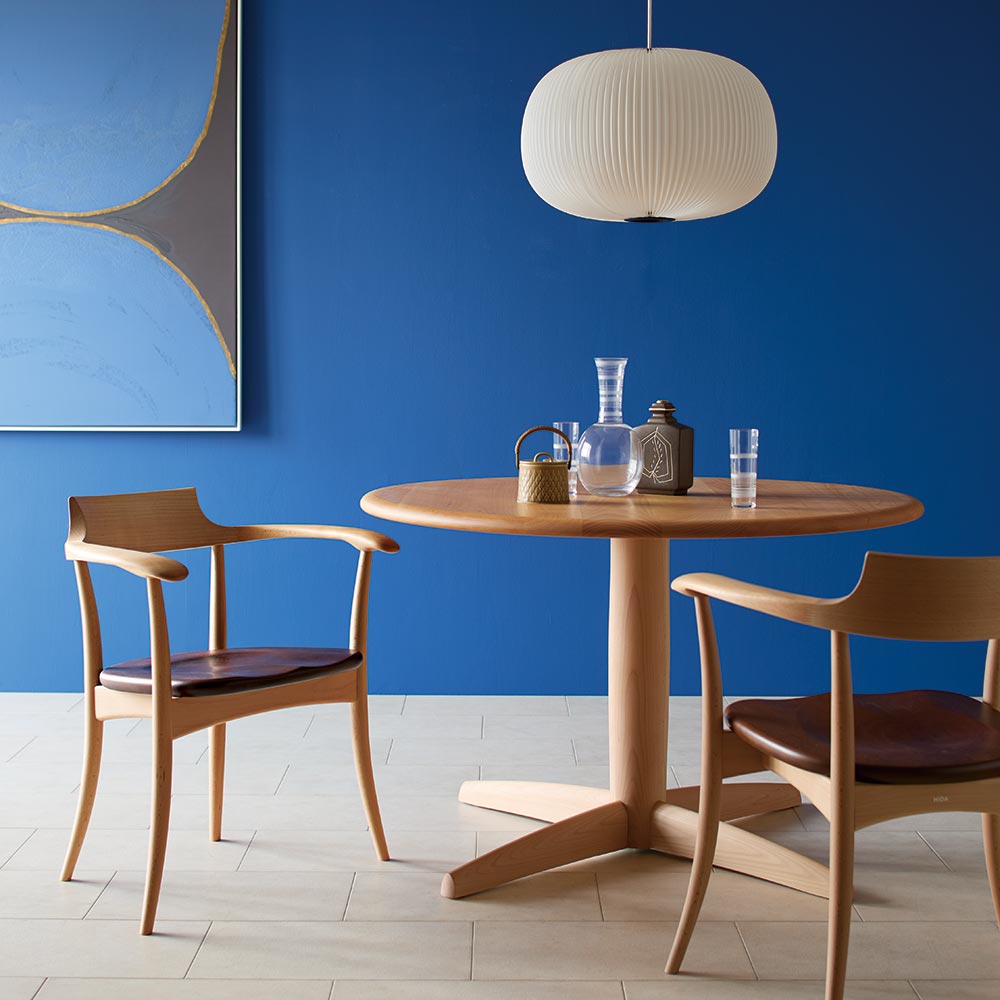 日本有数の家具の産地である岐阜県・飛騨高山。1920年に創業した「飛騨産業」は、“ 飛騨の匠”で知られる伝統技術、山々に密生した豊富なブナ原生林を資源に持つこの地で一世紀もの歴史を刻み、「キツツキマークの木製家具メーカー」として国内のみならず、世界でも高い評価を得ています。自分のために選びたい日々を豊かにする国産のテーブルはどこから眺めても美しいシルエット、妥協のない精巧な細工、堅牢な使いやすさ― 。飛騨産業の家具には、いにしえの造都や寺院建設に貢献したといわれる名工たち、飛騨の匠の技と心が確かに息づいています。