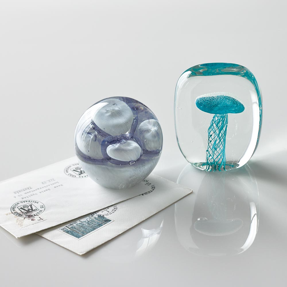 ペーパーウェイトとしてもお使いいただけます。 画像は別売りのSサイズです。左から泡(グレー)、クラゲ(グリーン)