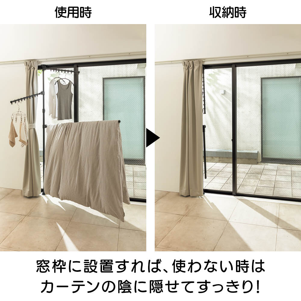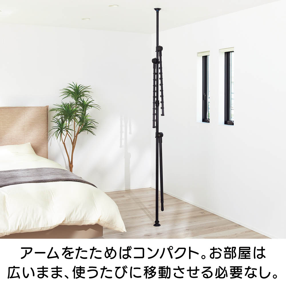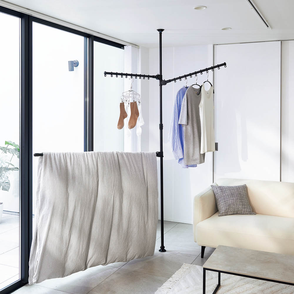 マットな質感のブラックでテイストを選ばずコーディネートできます。たたんだ時の立ち姿もシンプルなので、お部屋のイメージを損ねません。省スペースで布団が干せるアーム付き。窓際で布団の室内干しができます。