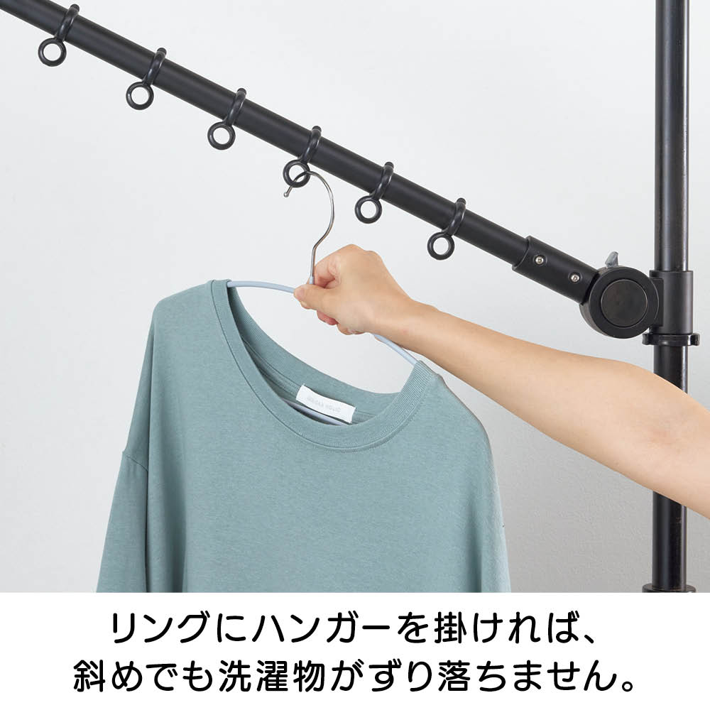 ハンガー掛けリングが10個付いたアーム2本に加え、伸縮する布団干し1本付き。洗濯物が多い時は布団干しへ洗濯物を掛けることもできます。
