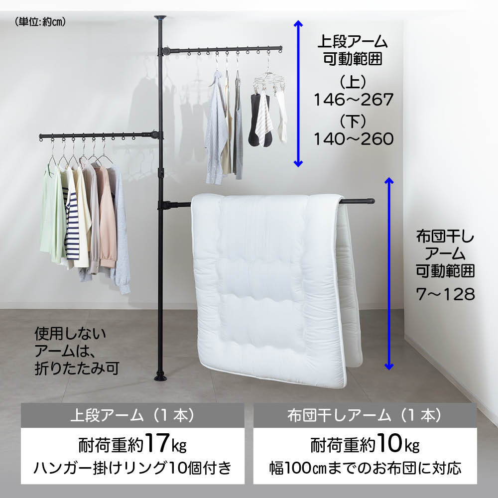 ■耐荷重(1本あたり):アーム…約17kg、布団干しアーム…約10kg