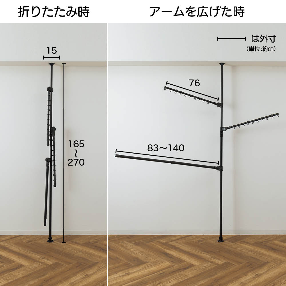 ■サイズ:天井対応高さ168~270cm、アーム長さ…76cm、 設置部…直径8cm、収納時…約径15cm、 布団干しアーム…長さ83~140cm