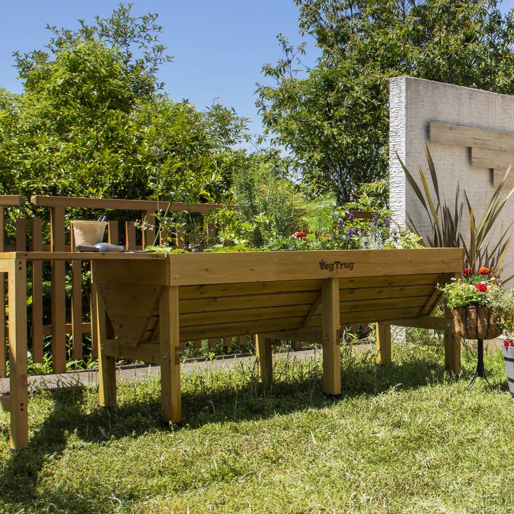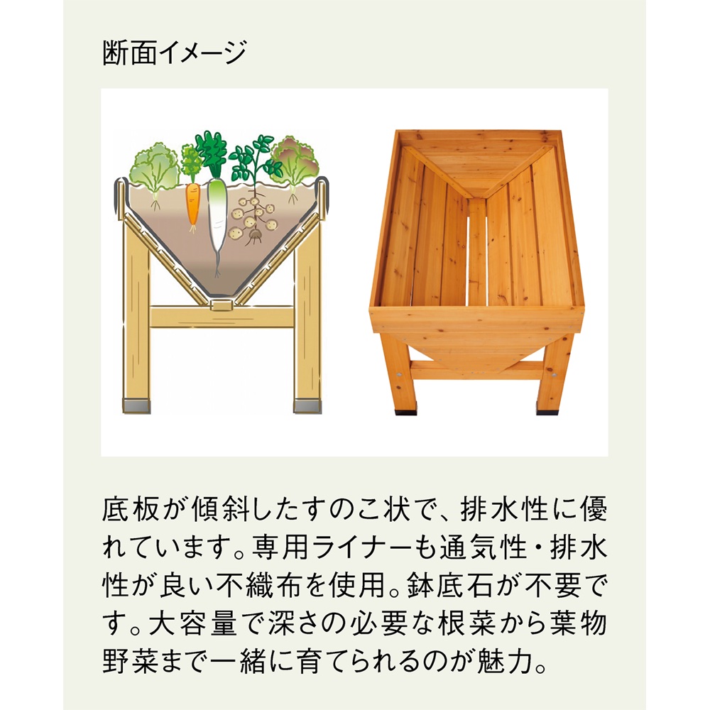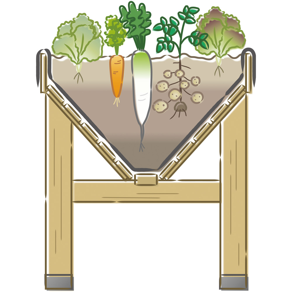 独自の「V型形状」により根を張る根菜など、さまざまな野菜や植物を育てることができます。腰を屈めずに作業ができる高さなので、水やりや植え替え、メンテナンスが楽に行えます。また、腰の悪い方や、車椅子に乗ったままでも作業ができます。