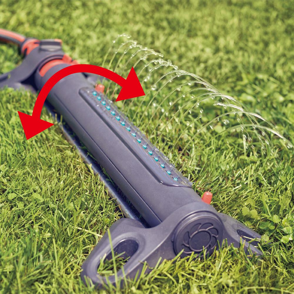 水圧で左右に首を振って均等に散水。乾燥期の芝生も生き生き育てられます。散水する範囲は簡単に調節可能。ドイツの園芸用品のトップブランド〈ガルデナ〉の製品です。