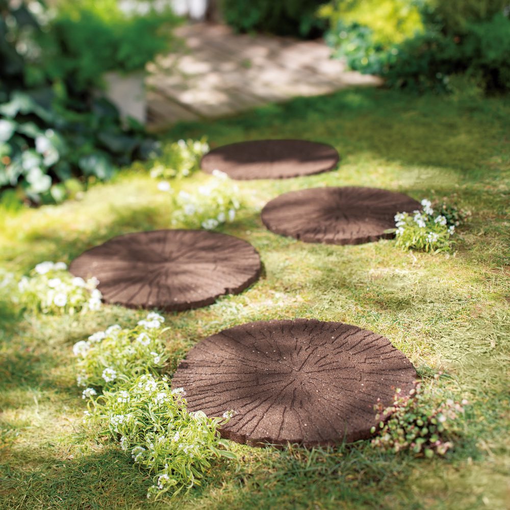 輪切りの丸太を再現したステップ。連続して置くことでゾーニングができ、小さなドラマが生まれます。リサイクルラバー製だから踏んでも割れず、朽ちる心配もありません。