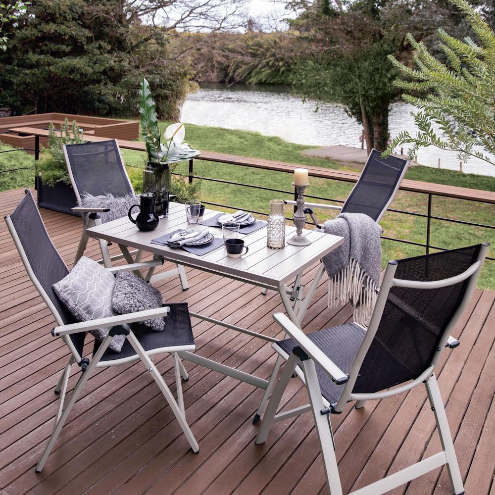チェアはガーデンのダイニングチェアにも、リクライニングチェアにもなる設計。
