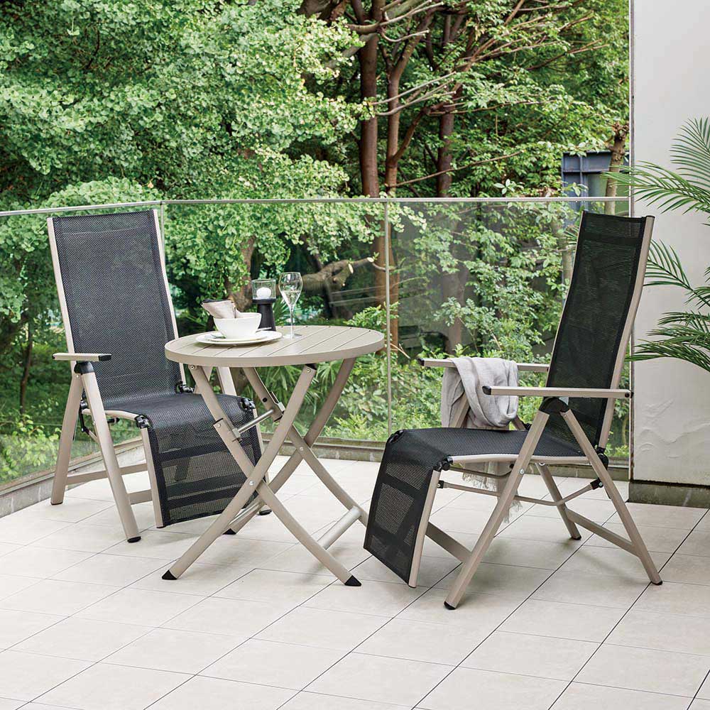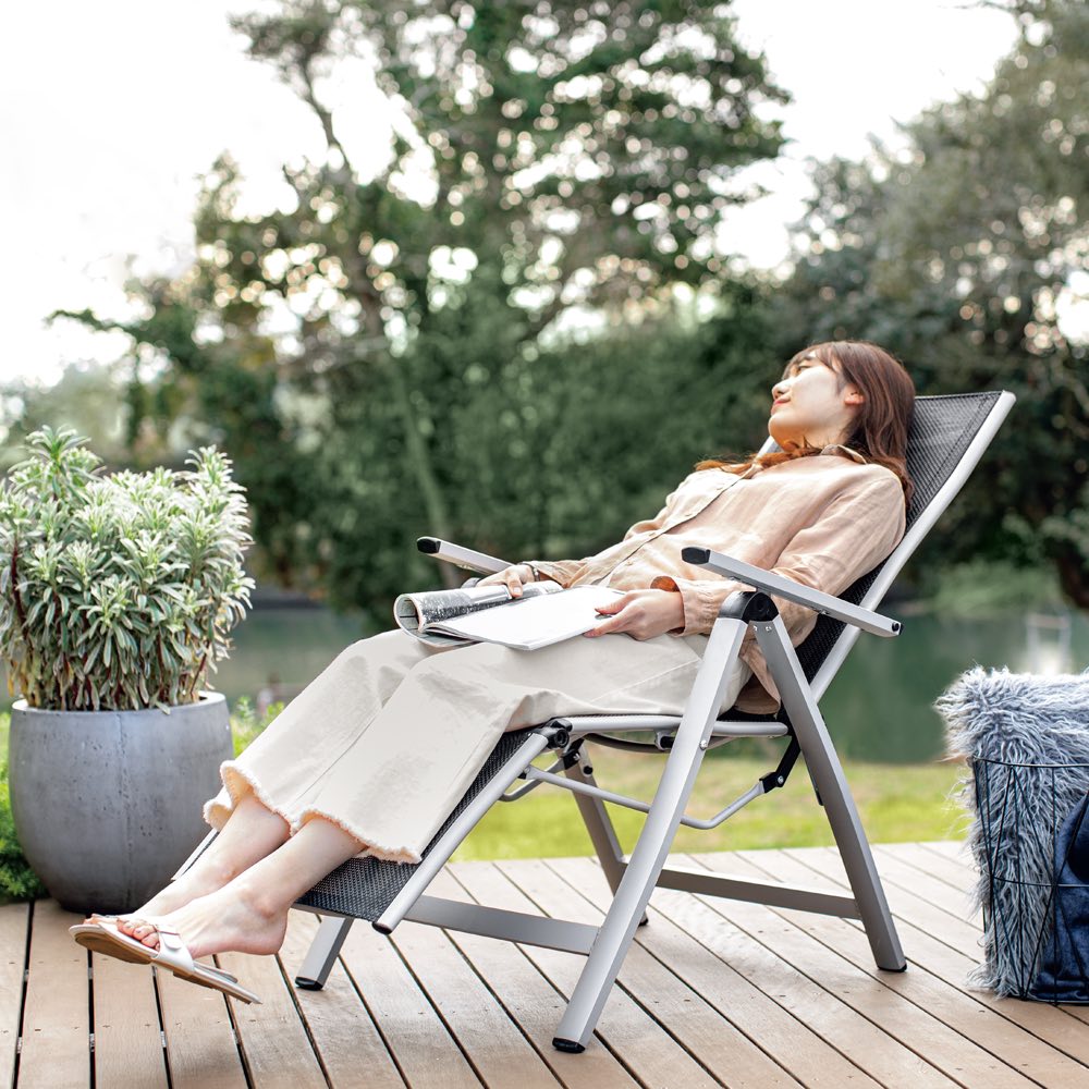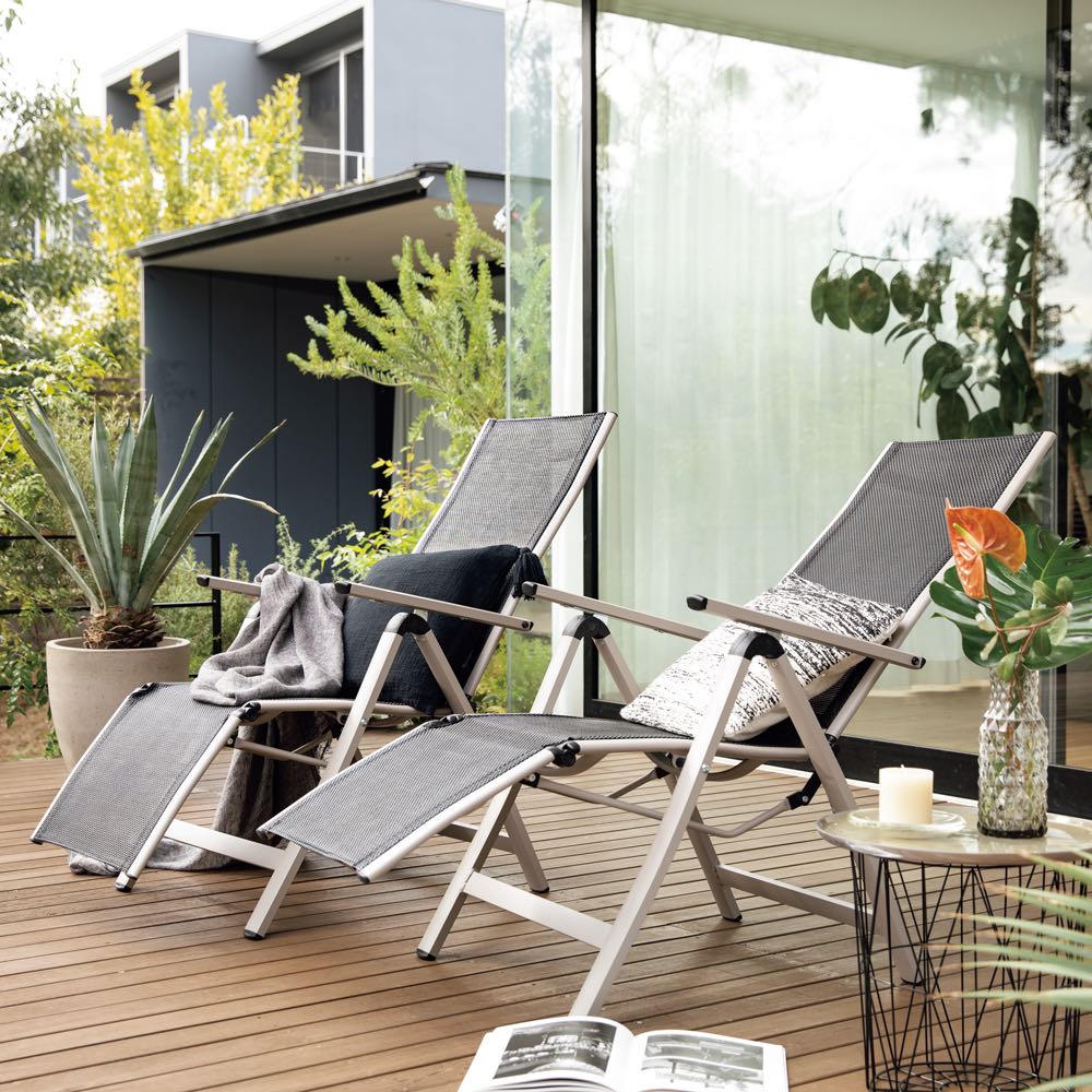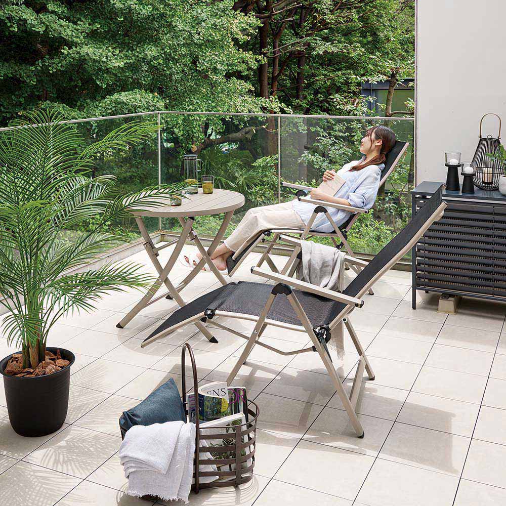チェアはガーデンのダイニングチェアにも、リクライニングチェアにもなる設計。