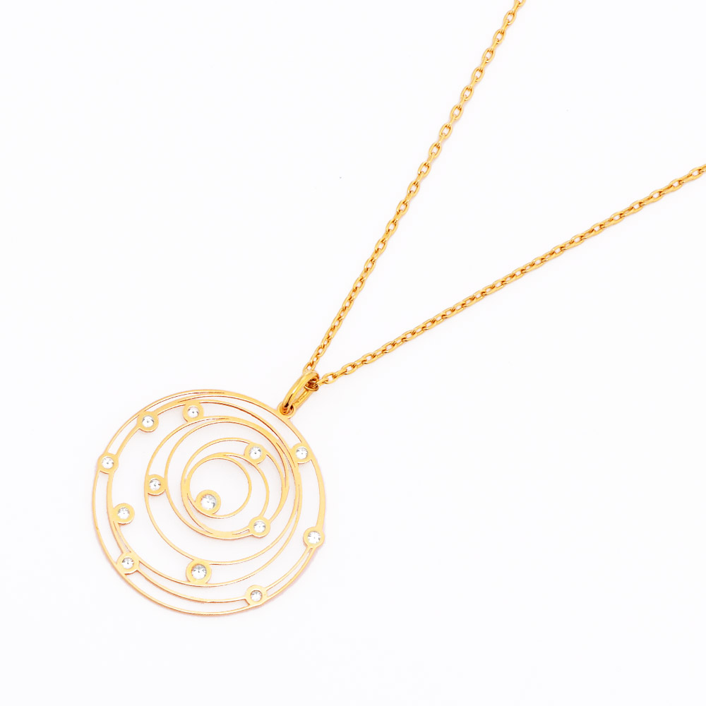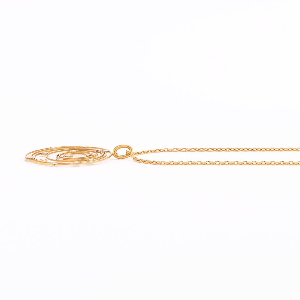 レーザーカットによるランダムな地金のサークルに、ちりばめられた強い輝きを放つダイヤ。エアリーなデザインを驚くほど薄く、軽い着け心地で楽しめるペンダントです。商品画像の説明
