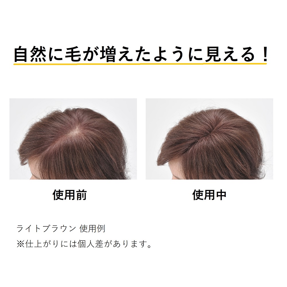 生え際やつむじなど、気になる部分にふりかけることで、特殊加工した繊維状の人工毛が自毛に付着。まるで自毛のような自然なボリューム感を生み出します。さらにスーパーミリオンヘアミストEX(別売)をスプレーして仕上げれば、雨・風・汗にも強くなり、ふんわりスタイルが長続き。