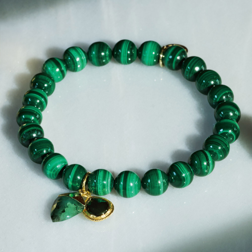 多くのジュエラーが注目するマラカイトは、幸運と成功のお守りにと、ヒラリーもお気に入りのラッキーストーン。着脱が簡単なゴム式のブレスレット。リュクスなエメラルドとブラックスピネルのチャームが、洒落たワンポイントに。商品画像の説明。