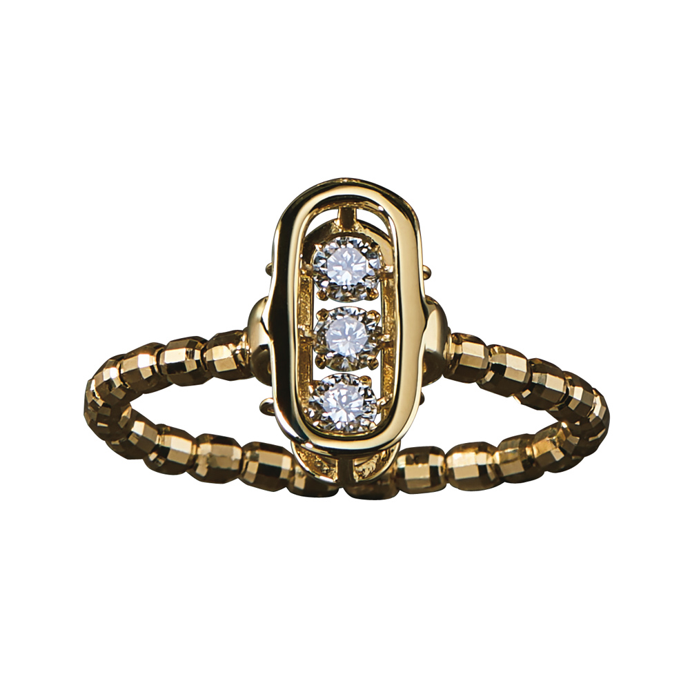 ダイヤがフレームの中で絶え間なく揺らぎ、光を振りまくダンシングダイヤシリーズ。サイズフリー、着脱が簡単なストレッチ仕様はストレスを感じさせません。日本の職人の高度な技術を物語る画期的なジュエリーです。縦長フォルムのリングは、指をすっきり見せる効果も。