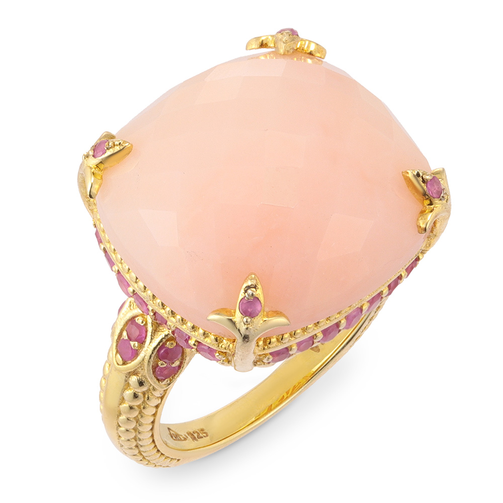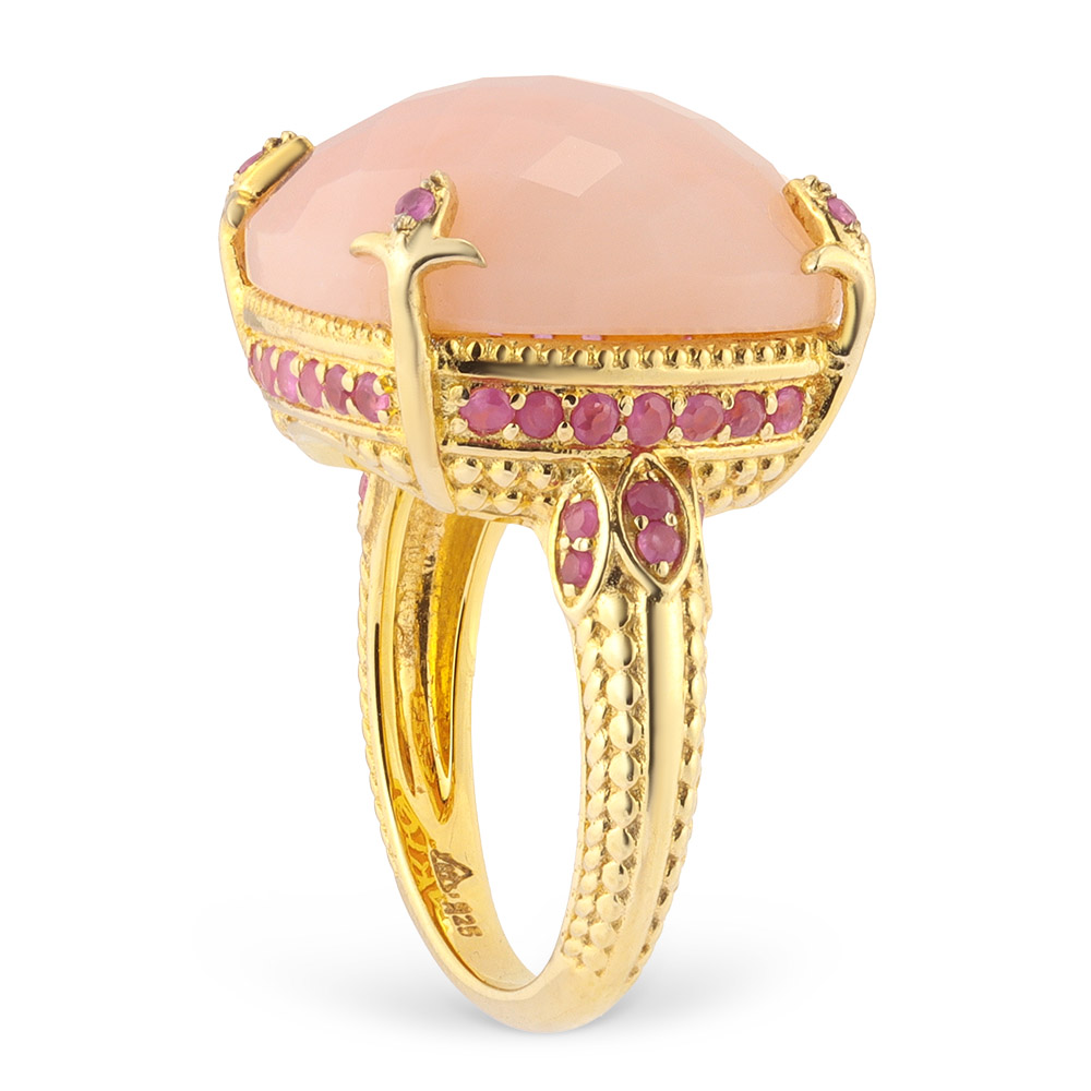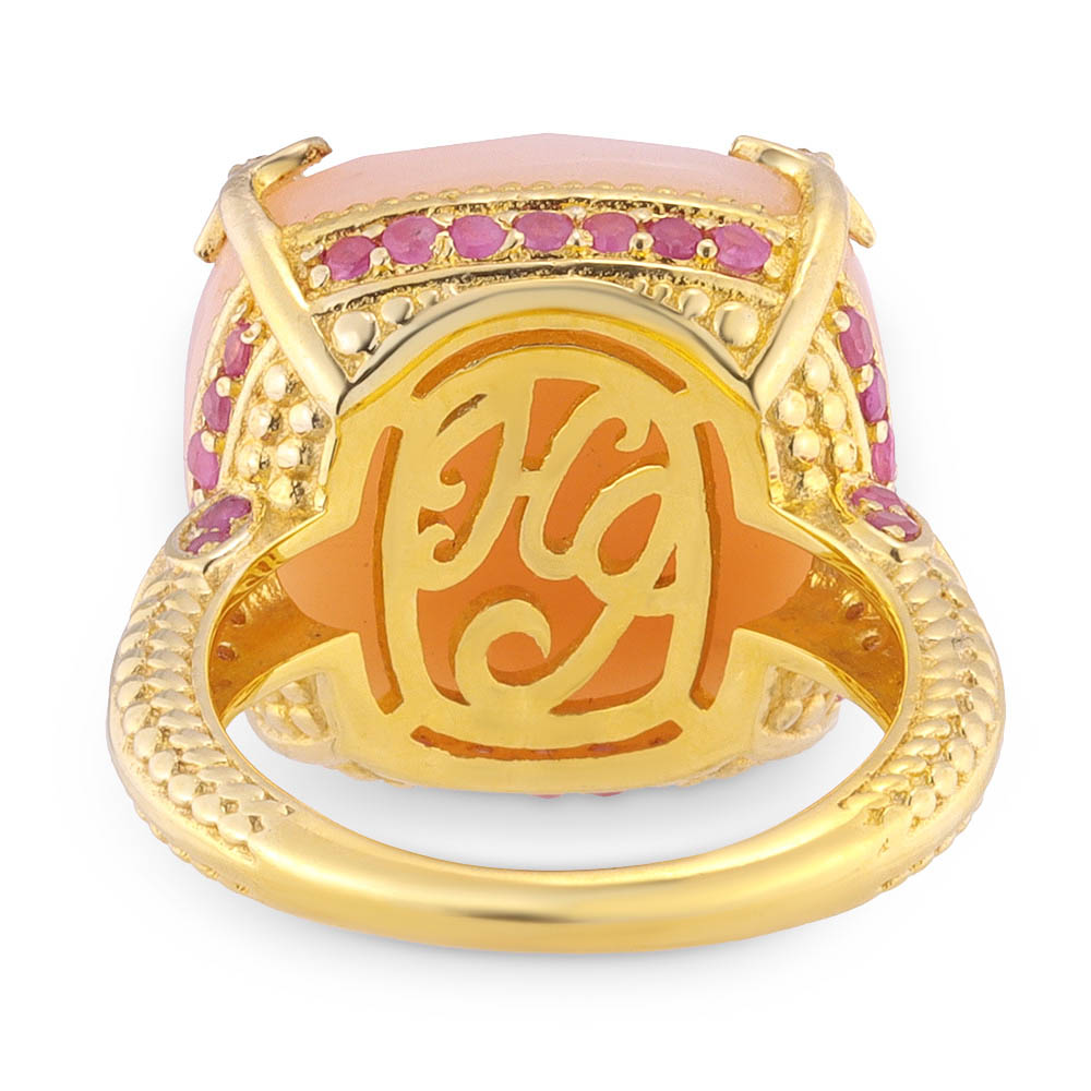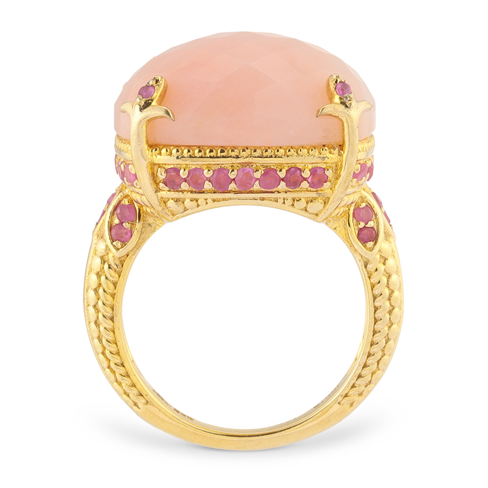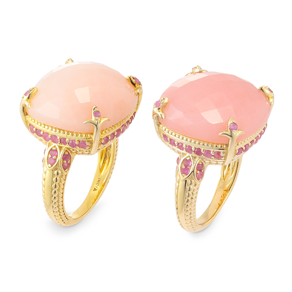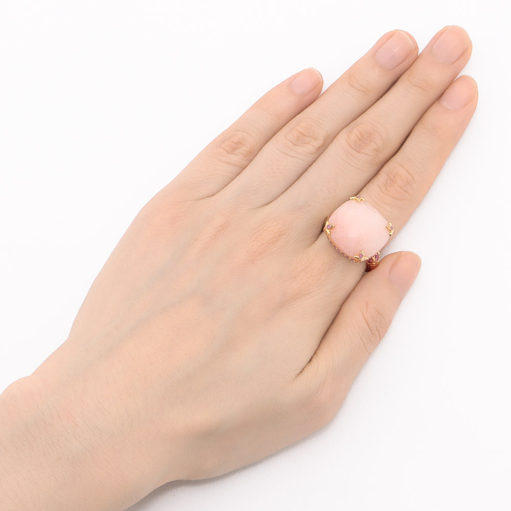 クッションカットの大振りのピンクオパールと、爪とサイドに配したピンクサファイアの対比が麗しいリング。Hilary Joy Couture/ヒラリージョイ