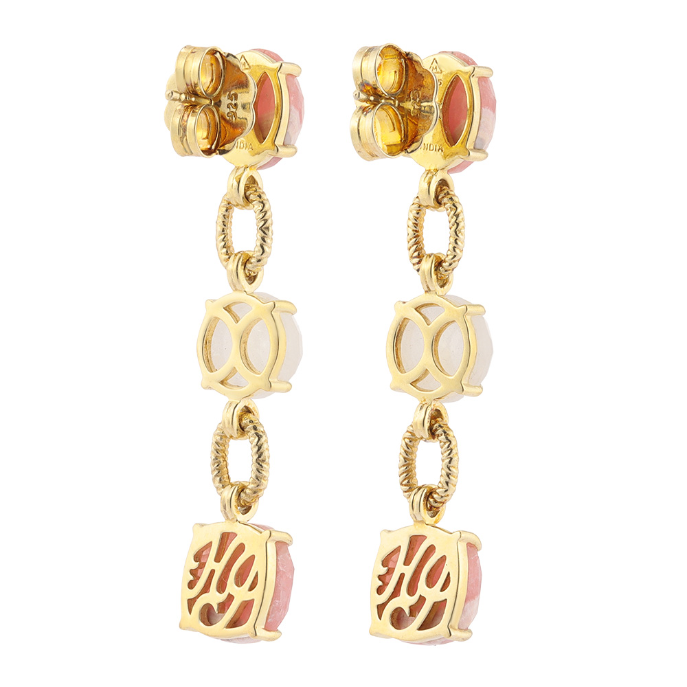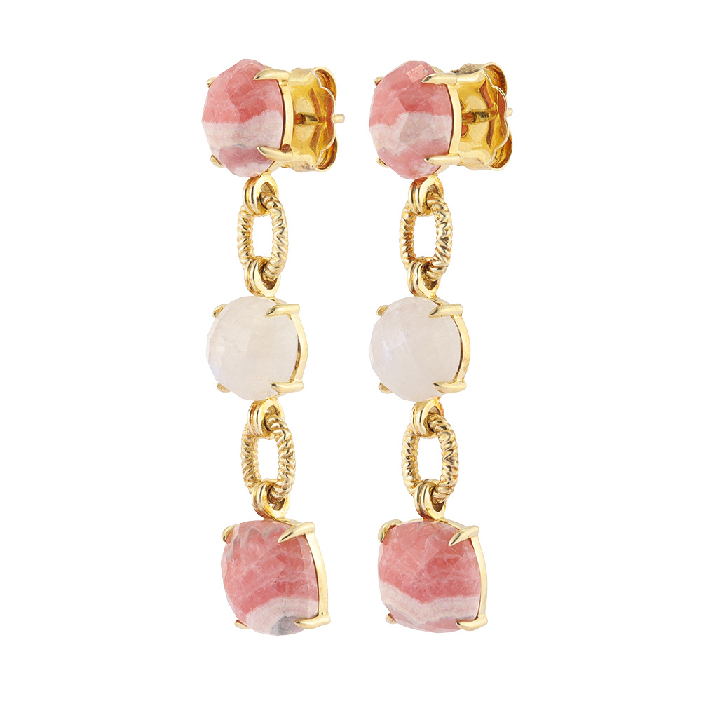 ロードクロサイトとムーンストーンの揺れるピアス。光を受けて耳元でチャーミングに煌めきます。Hilary Joy Couture/ヒラリージョイ