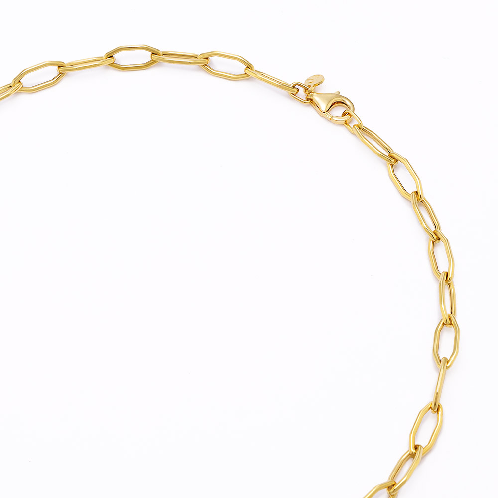 六角形にアレンジしたクリップ形のコマが光をランダムに反射して華やかに輝くベストセラーのネックレス。商品画像の説明