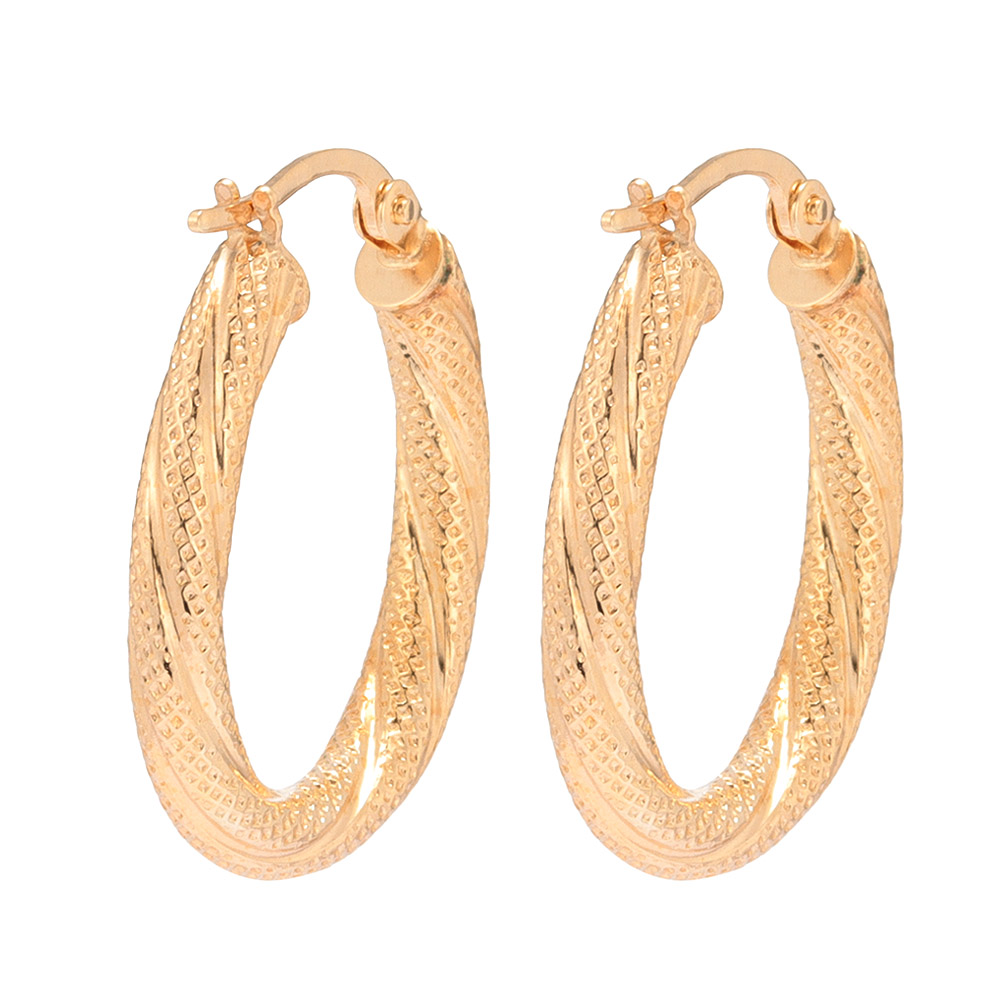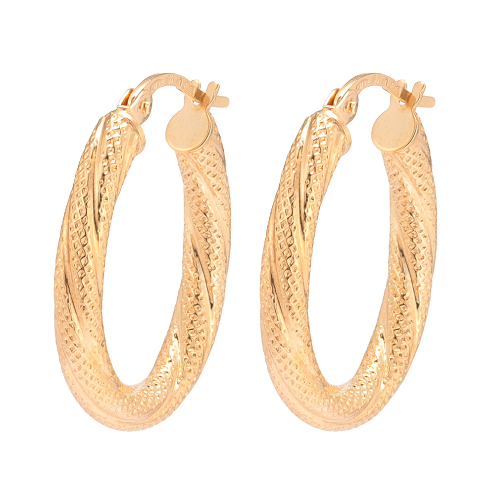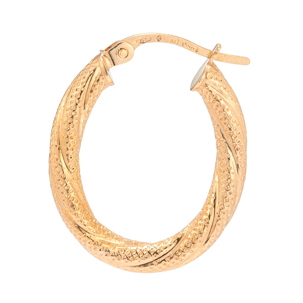 毎回好評の「ウノアエレ」から、他のジュエリーとも合わせやすくリーズナブルなK9のピアスをご紹介。テクスチャーと鏡面が上品に輝くオーバルフープ。中空仕様で軽い着け心地。商品画像の説明