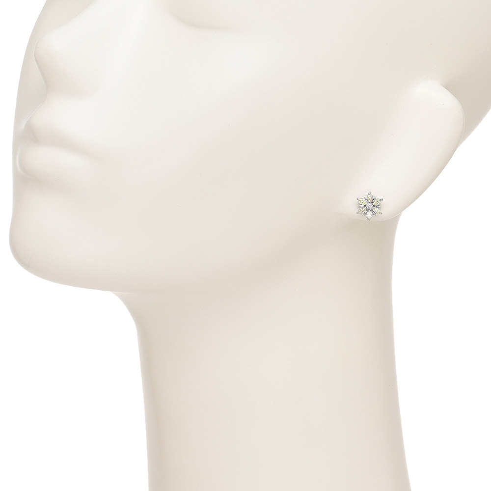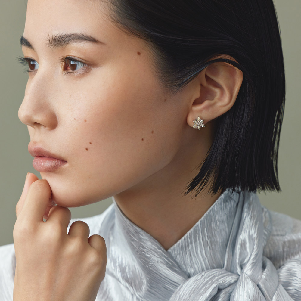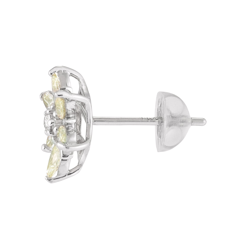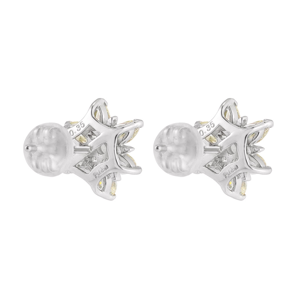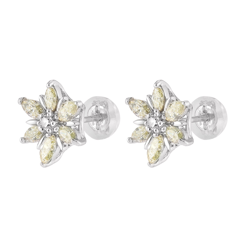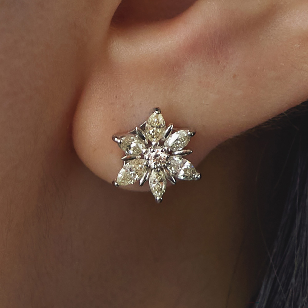 センターのラウンドダイヤをレモンイエローのマーキスカットダイヤで取り巻いた贅沢なピアス。職人が丁寧な手作業で仕上げた本物志向のつくり。