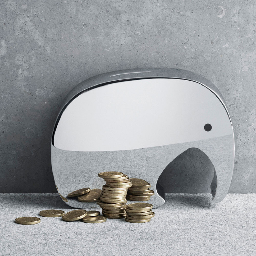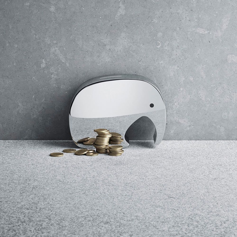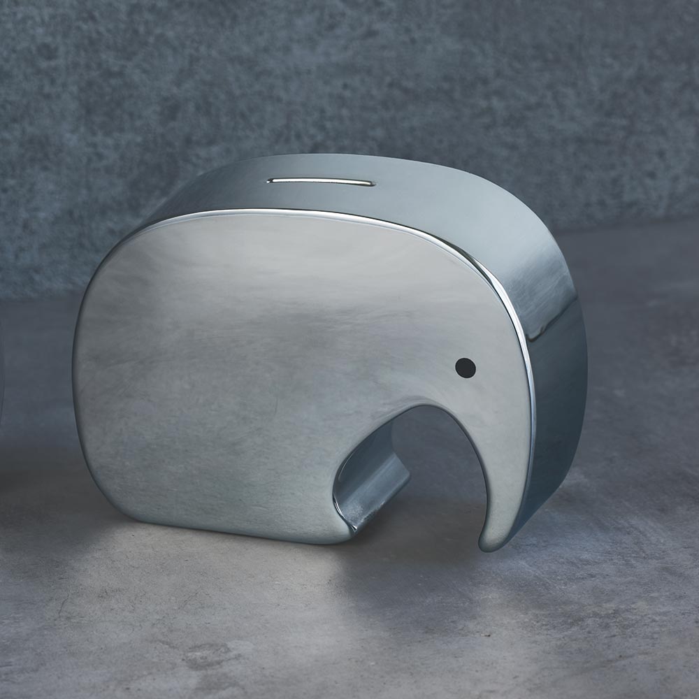 まるでオブジェのようなモダンで愛らしいゾウの貯金箱。