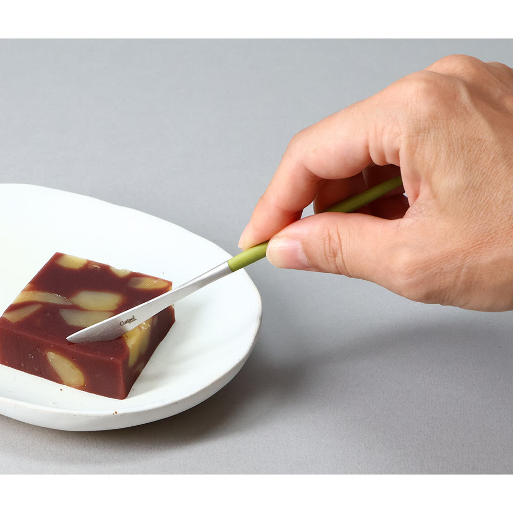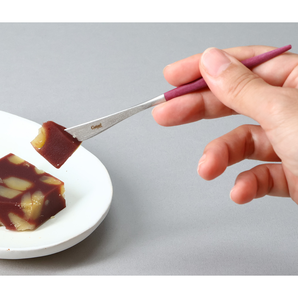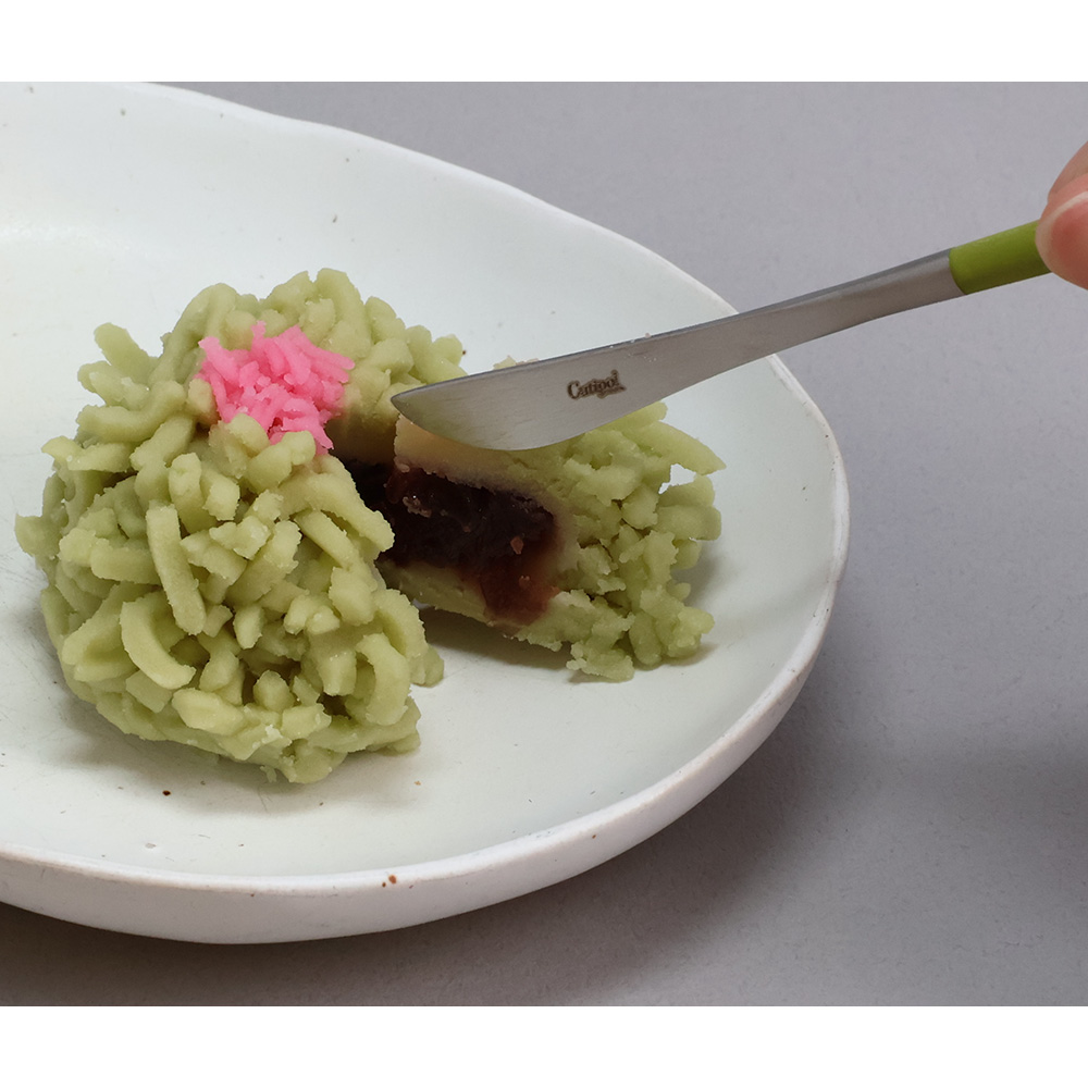 菓子切り…クチポールのナイフの形状を生かし、繊細な和菓子を崩すことなくカット。先端を突き刺して楊枝のように使っても