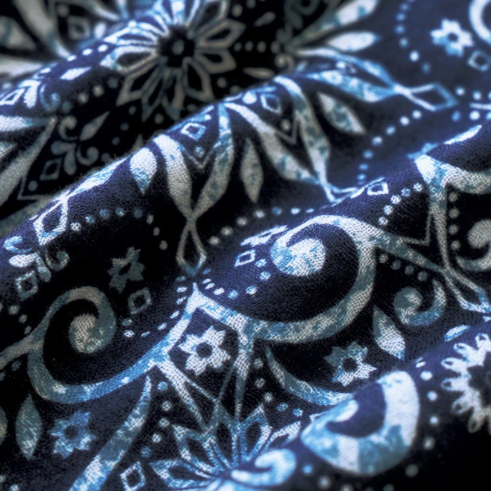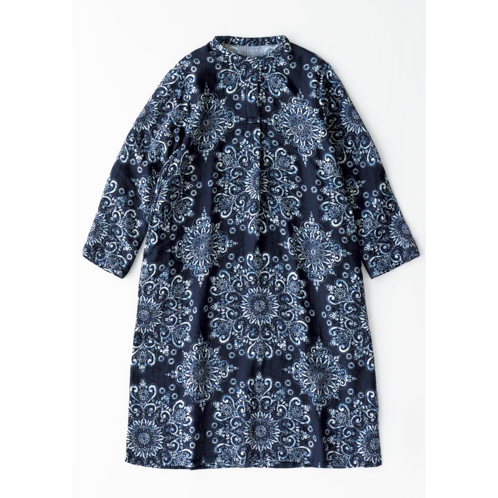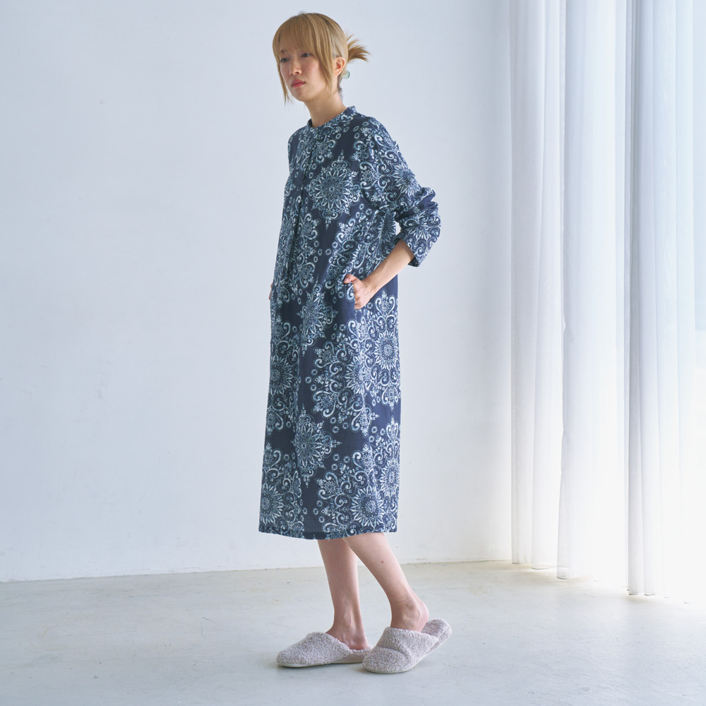 フランスのシャルトル大聖堂のステンドグラス柄から着想を得た、繊細で上品なプリント。程よく首に沿うスタンドカラーは、気になる首元を優しくカバーし、きちんと感を演出します。お風呂上がりだけでなく、急な来客時や、ちょっとしたお出かけにも着られるデザイン。リゾート地での特別なひとときにも映える、エレガントな佇まいです。
