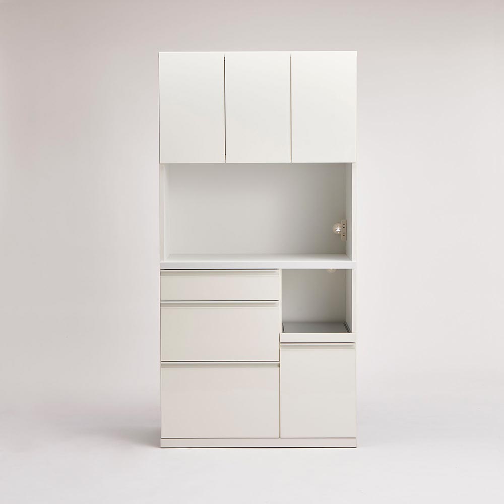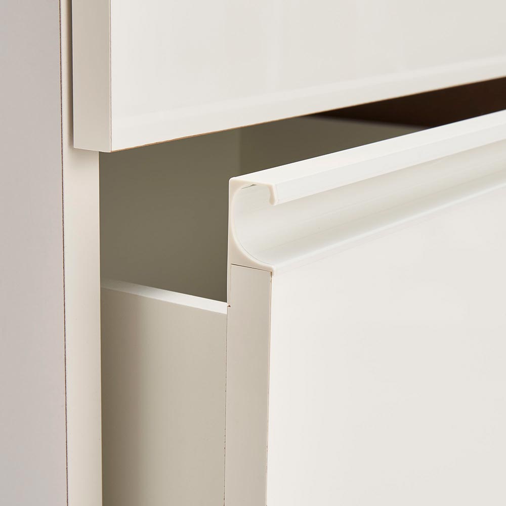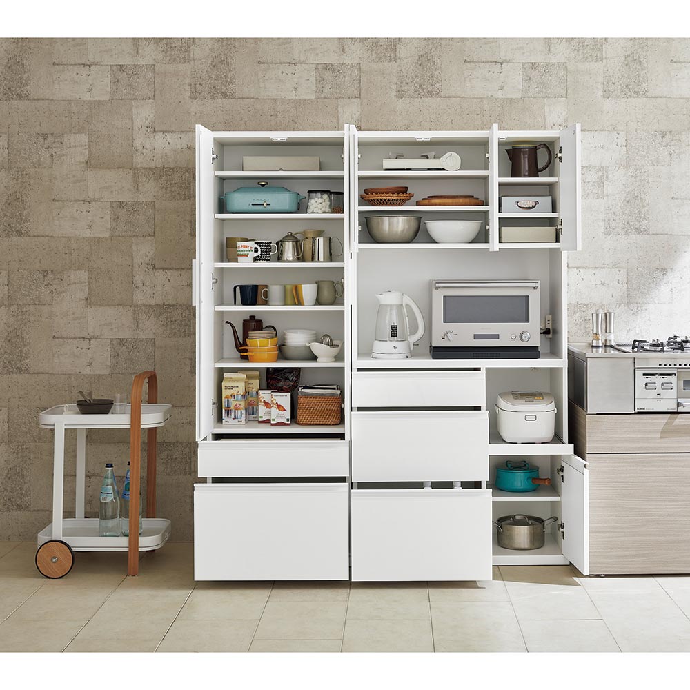 前面はツヤのあるホワイトに、本体はマットなホワイト。取っ手までホワイトで仕上げて、オールホワイトで統一感を持たせたこだわり。キッチン収納では定番の白も取っ手までホワイトで仕上げることで、より清潔感が際立ちます。安心と信頼の職人技が光る国産のキッチン収納