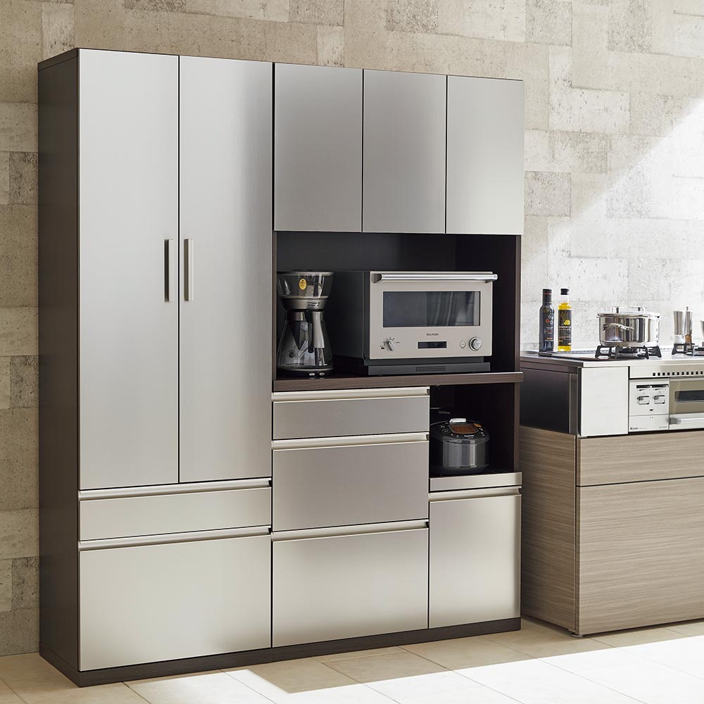 昨今多くみられるシルバー系の冷蔵庫とコーディネートしやすいカラー。正面は艶のあるシルバーにハンドルもシルバーで仕上げ一体感のあるデザイン。本体はとても細かい木目柄のダークブラウンで圧迫感を感じさせないよう、落ち着いた印象にまとめています。ホワイト