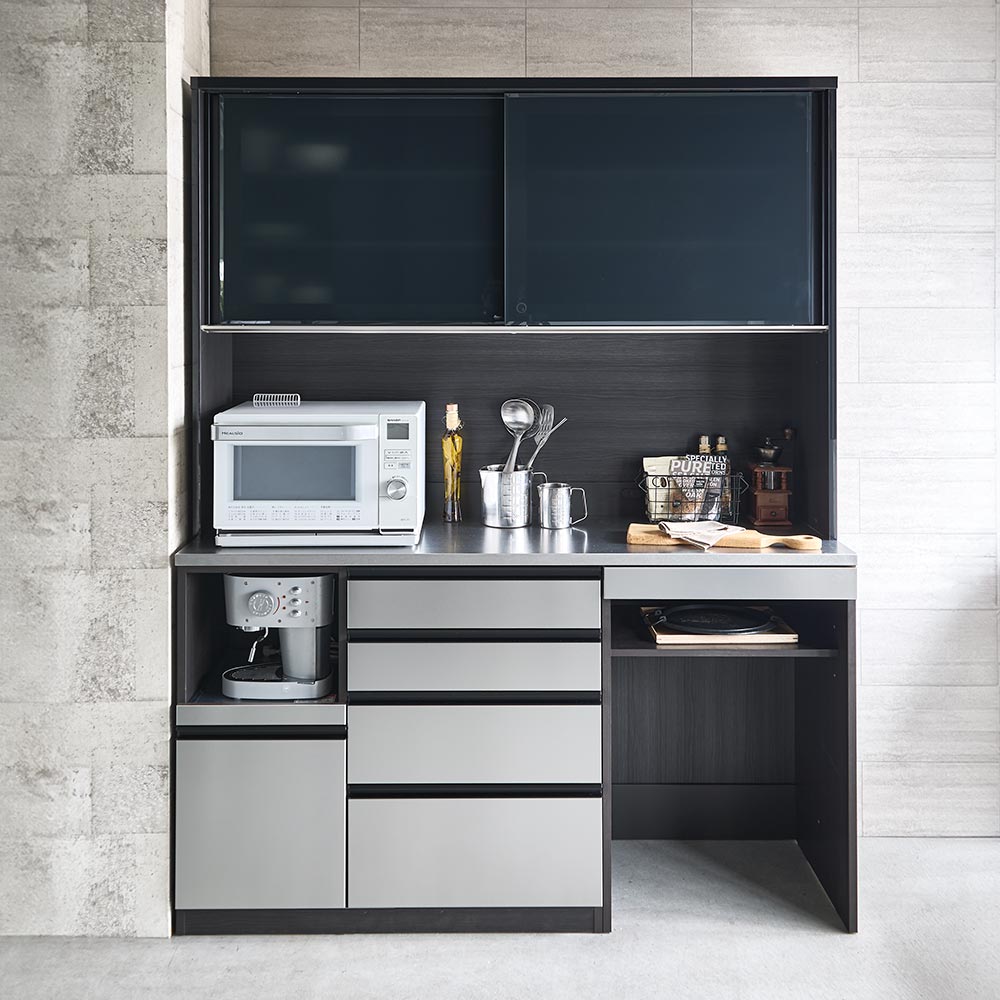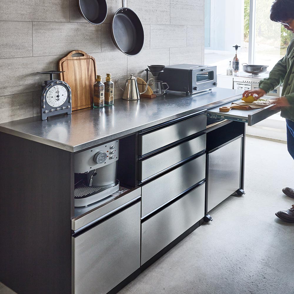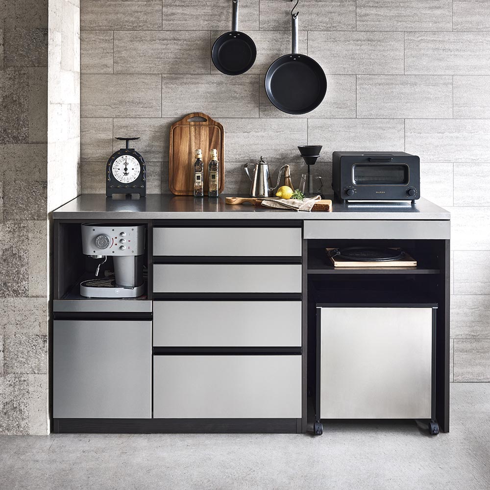 システムキッチン並みの高機能を持つステンレス天板のキッチンカウンター&ボードが、工事不要で設置可能。高級感あふれるスタイリッシュなデザインで、暮らしに合わせてユニットの左右選択や、幅180cmタイプは位置の組み替えもOK。