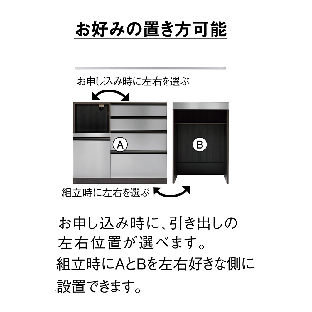 炊飯器や電子レンジを置くユニットと引き出しは、お手持ちのキッチン家電や作業導線によって設置位置を選べる!オープンユニットの位置は組替が可能で、暮らしに合わせてお好みで設置が可能。
