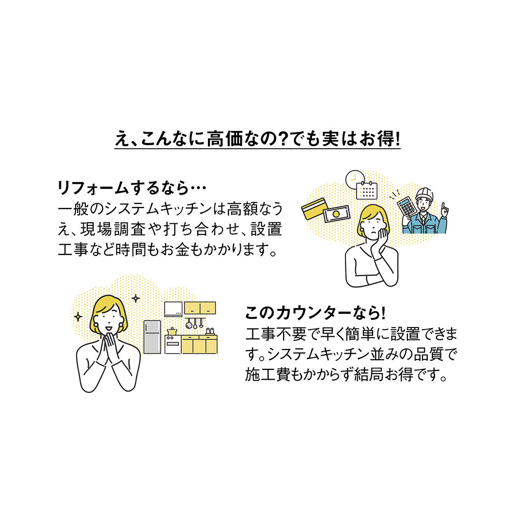 現地調査や設置工事が不要で、置くだけの簡単設置。コストを抑えてシステムキッチンクラスの高機能を自宅で楽に楽しめます。