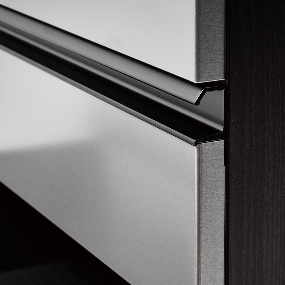 フロント部分はヘアライン加工のステンレスの質感をリアルに再現した、お手入れのしやすい塩化ビニールのシートを、縁の曲面も含めて1枚のシートを連続で貼り込むラッピング仕上げ。サイドまで1枚のシートを連続して貼り込むため手間と技術が必要ですがその分耐久性が高く、ステンレスの質感をよりリアルに再現したデザインが特徴です。