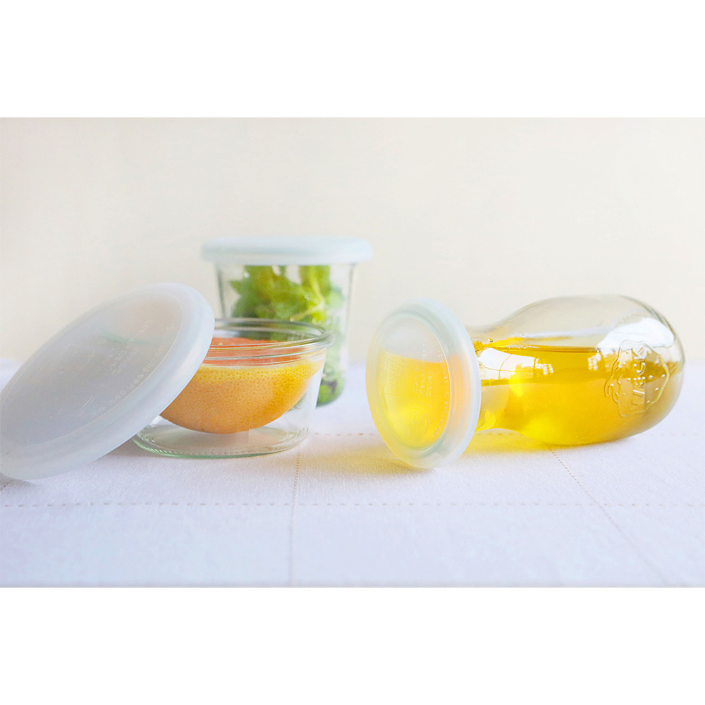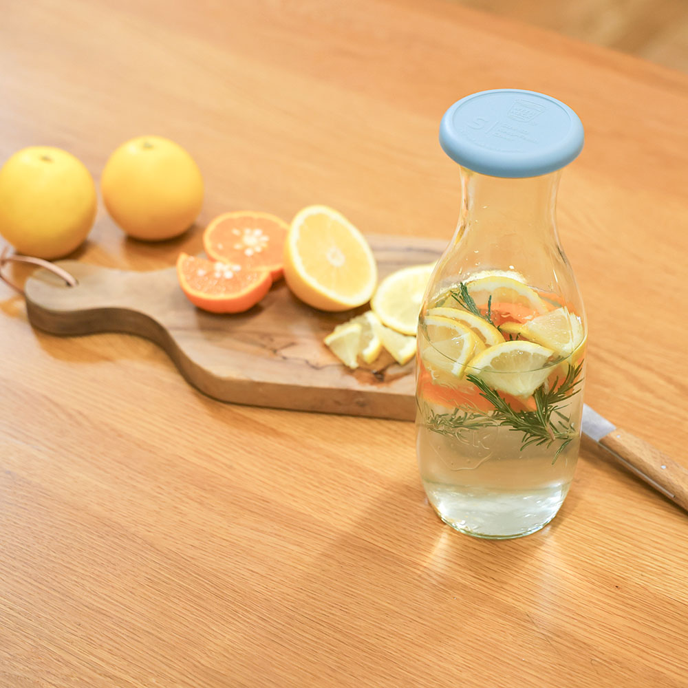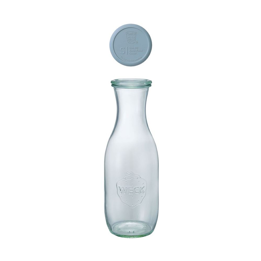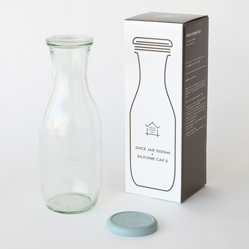 JuiceJar1000mlのガラスキャニスター ×1個、シリコーンキャップS ×1個(色はグレイッシュブルー)WECKはキャニスター本体も蓋も、ラインナップの豊富さと組み合わせの自由度が自慢ですが、あえてこれがあればOKという使い勝手のよいセットにしてお届けします。