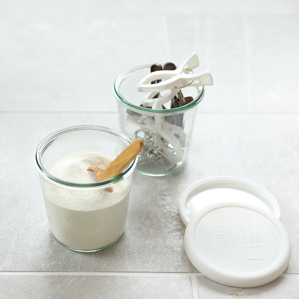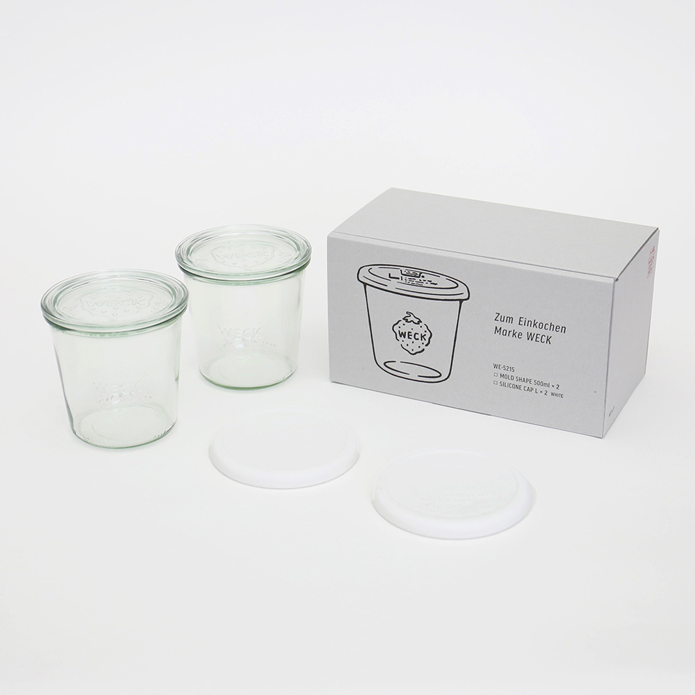 Mold500mlのガラスキャニスター×2個、シリコーンキャップL×2個(色はホワイト)WECKはキャニスター本体も蓋も、ラインナップの豊富さと組み合わせの自由度が自慢ですが、あえてこれがあればOKという使い勝手のよいセットにしてお届けします。商品画像の説明。
