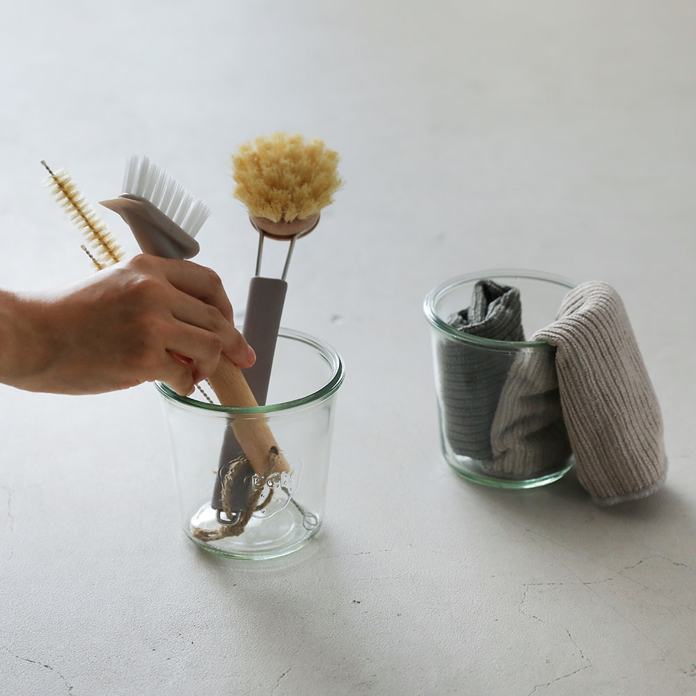どっしりと安定感のあるサイズと形は口が広くスプーンの出し入れがしやすく、キッチンで調味料ストッカーとして活躍してくれます。目安として、小麦粉350g、塩500g、砂糖350g、パン粉100g、片栗粉250g、コーヒー150g程度が入ります。キッチンだけでなく、様々なツールポットとしても。掃除用のブラシ類、ドライバーやペンチなどの工具などなど、道具を整理するツールポットとしても便利です。●WECKってどんなもの?