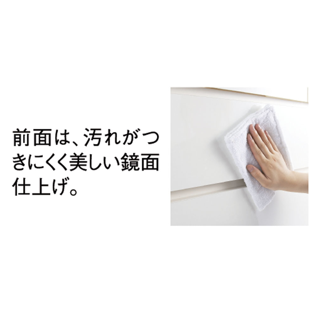 天板・側面、にはキズや汚れに強い強化化粧合板を使用。前面は美しい光沢仕上げで、