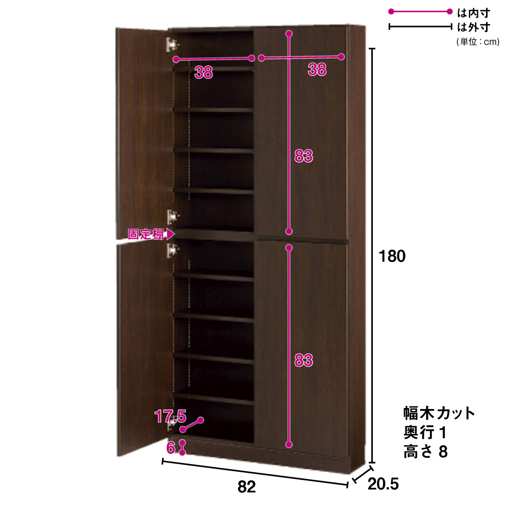 (ア)ダークブラウン 写真は、高さ180cm扉タイプの幅82cm、123cmと上置き幅82cm、123cmの組み合わせ例です。 わずかなスペースで大量収納に早変わり!