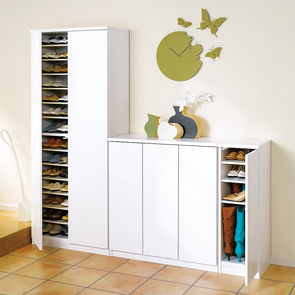 表面は傷に強く汚れが落としやすいポリエステル化粧合板。光沢仕上げなので、明るく清潔感のある印象です。棚板は高さを1cm間隔で調節でき、手前と奥で棚板の高さを変えられます。ブーツも収納OK!