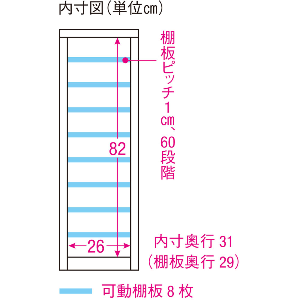 ■可動棚板:8枚付き(1cm間隔調節で60段。1枚サイズ幅26奥行15厚さ1.4cm)