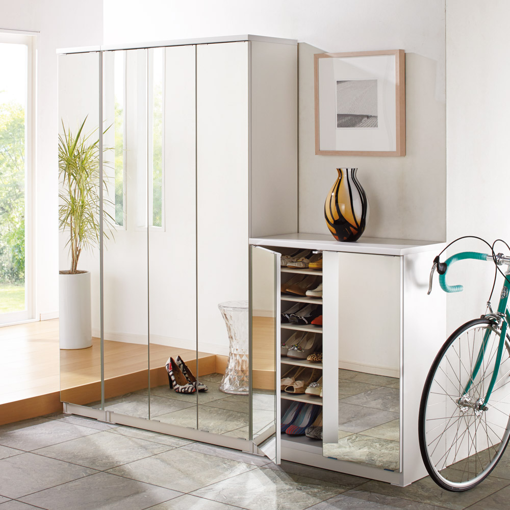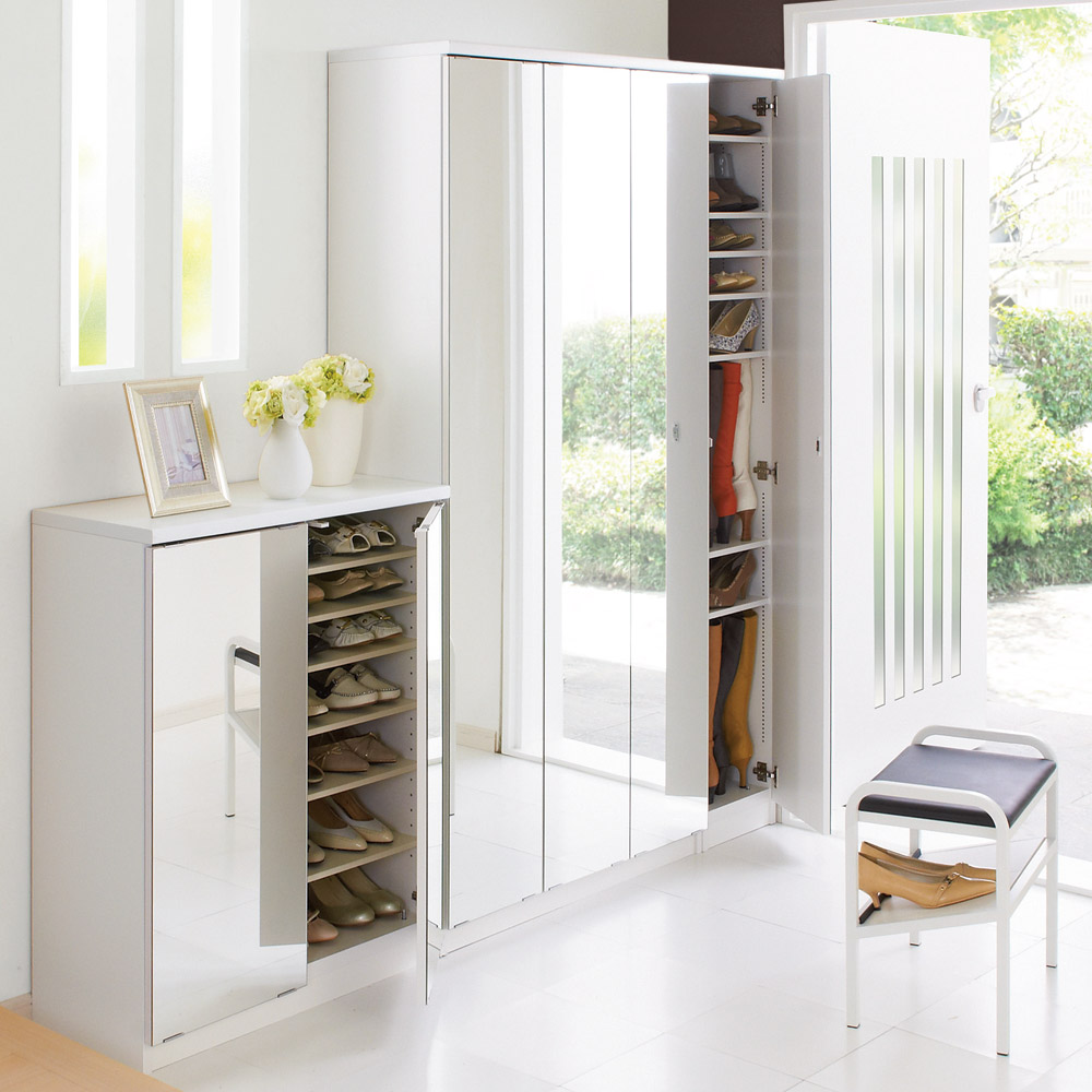 玄関に置くだけで靴の収納スペースだけでなく、お出かけ前の身だしなみチェックにも使えます。玄関に奥行感が出て広くみえます。