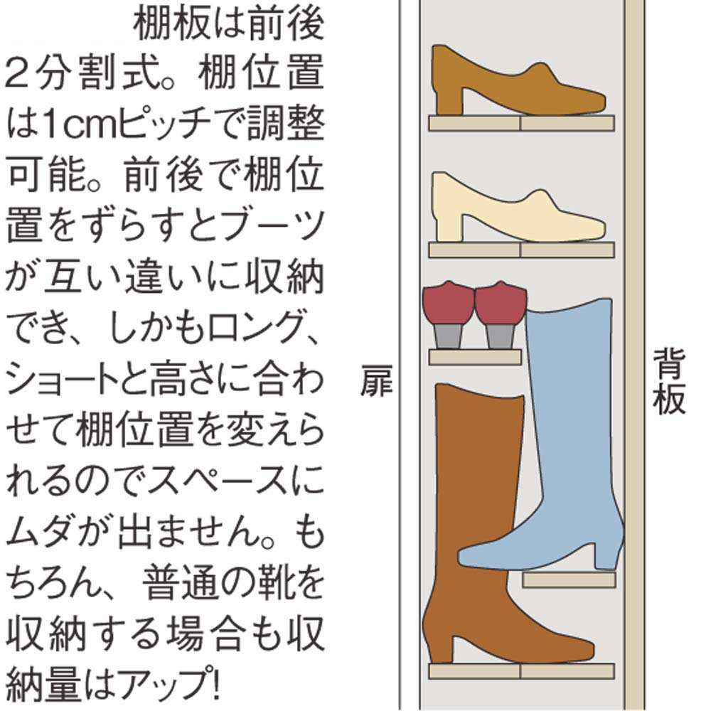 設置位置が1cmピッチで調節できる棚板は前後2分割式(段違い式)。前後で棚位置をずらすとブーツが互い違いに収納できます。