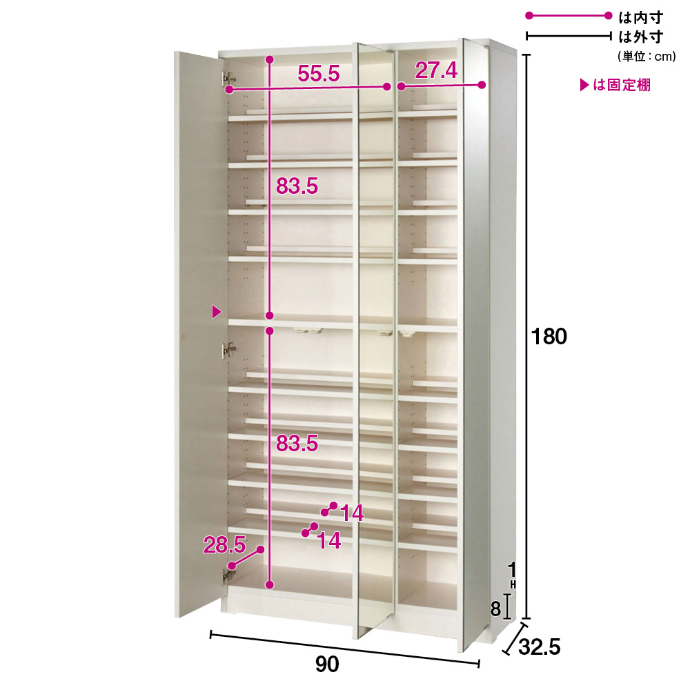 収納部内寸 左側:中段の固定棚を挟んで上下とも、幅55.5cm 奥行28.5cm 高さ83.5cm 右側:中段の固定棚を挟んで上下とも、幅27.4cm 奥行28.5cm 高さ83.5cm