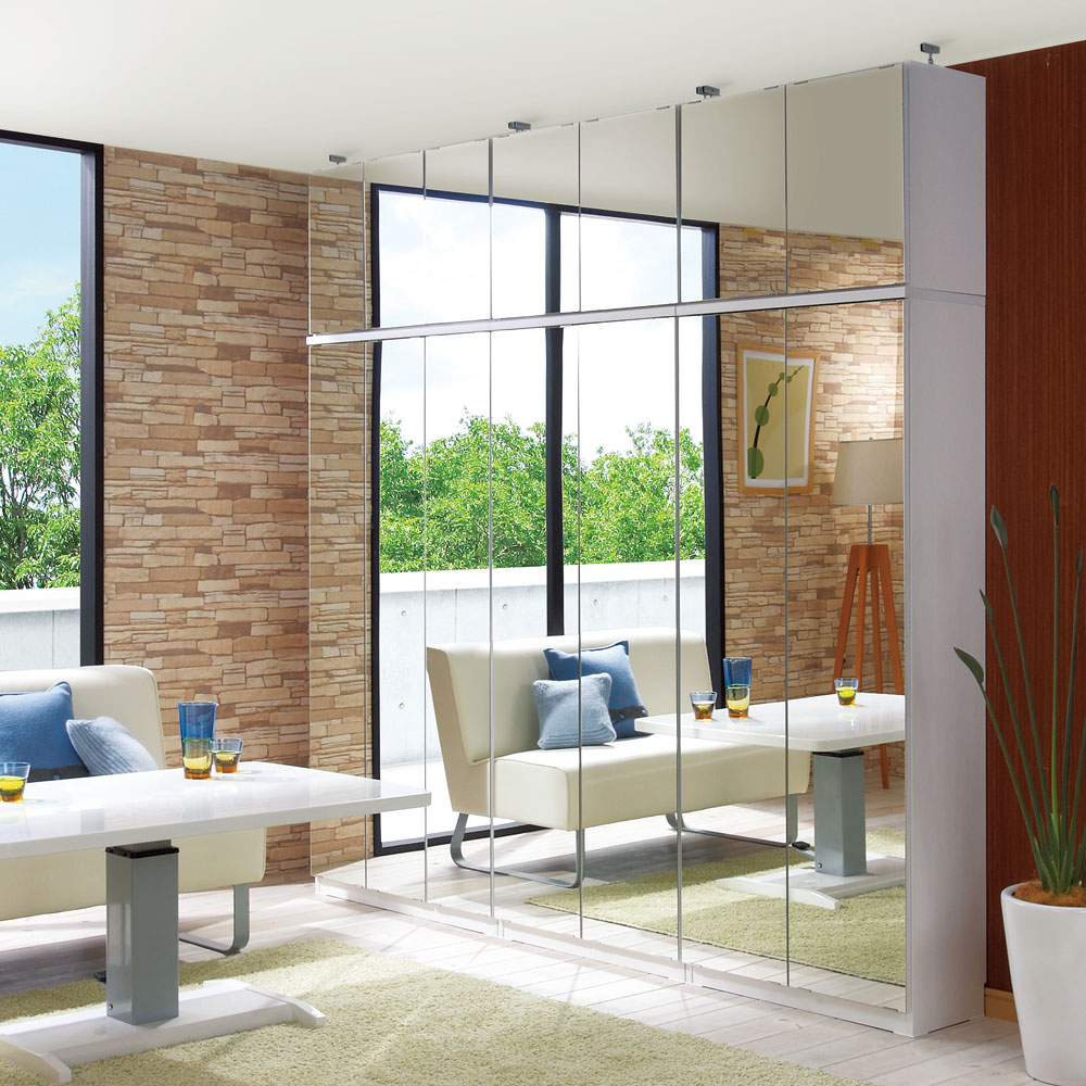 突っ張り上置きとの設置例 幅が同じサイズであれば、ミラー扉と板扉は組み合わせ可能です。写真はミラータイプの本体と板扉の上置きとの設置例です。