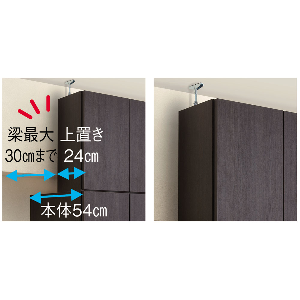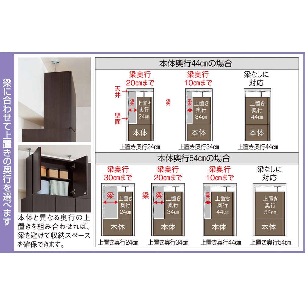 本体と異なる奥行の上置きを組み合わせれば、梁(はり)を避けてまるで造り付けのように設置可能。