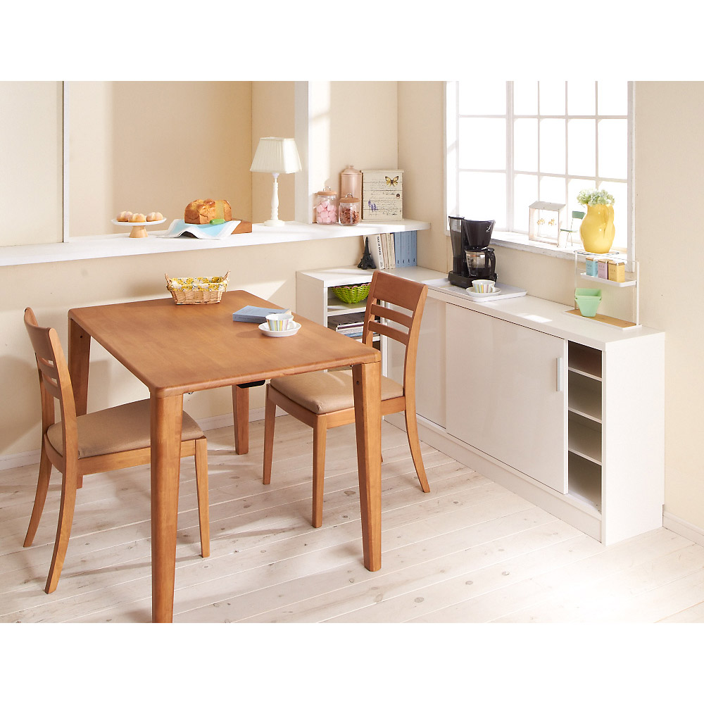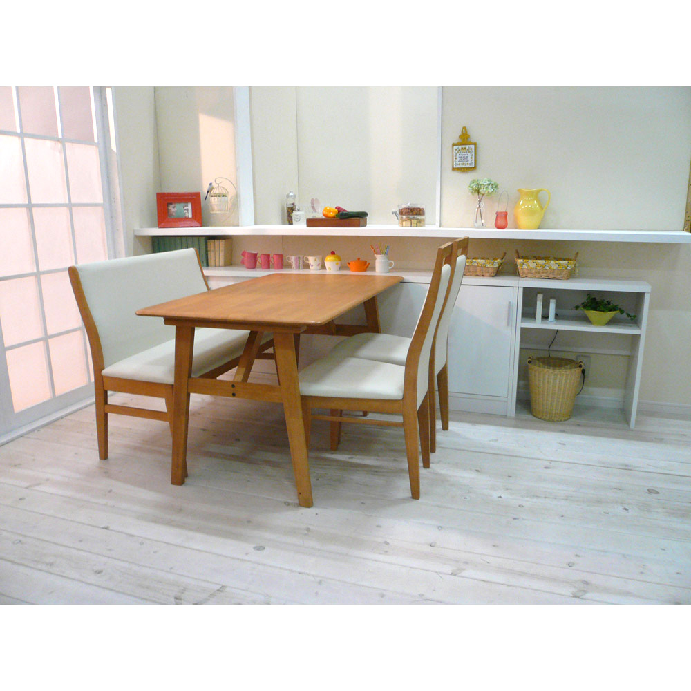 • コーディネート例(ア)ホワイト  一般的なダイニングテーブルの高さに合わせており、テーブルの延長上でフラットな使い方の提案商品です。