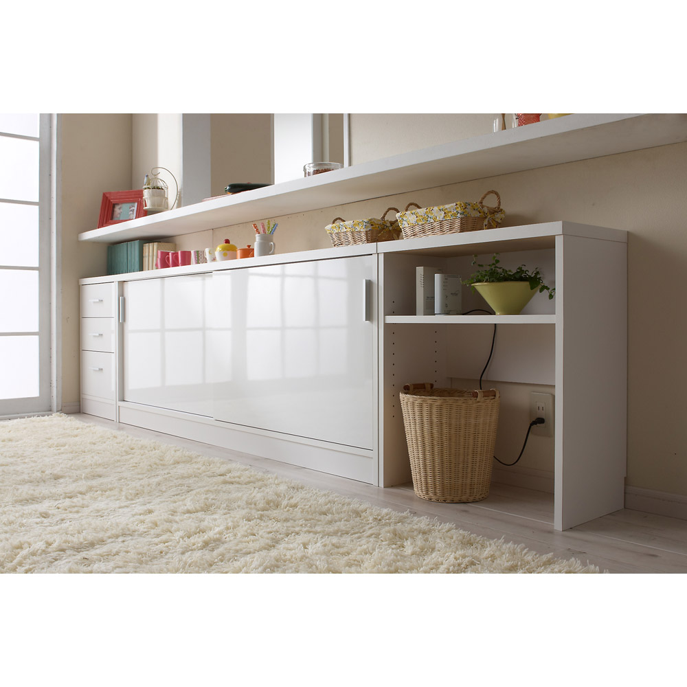 使用例:奥行29.5高さ87cmタイプ 左から引き出し、収納庫(幅90cm、幅120cm)サイズバリエーションが豊富なカウンター下収納高さ、奥行、幅が選べる「カウンター下収納庫シリーズ」。薄型の引き出し・オープンラック・収納庫を組み合わせて、デッドスペースを収納に活用できます。前面には光沢が美しく、キズ・汚れに強い素材を使用。お部屋に清潔感をもたらしてくれるマルチ収納庫です。