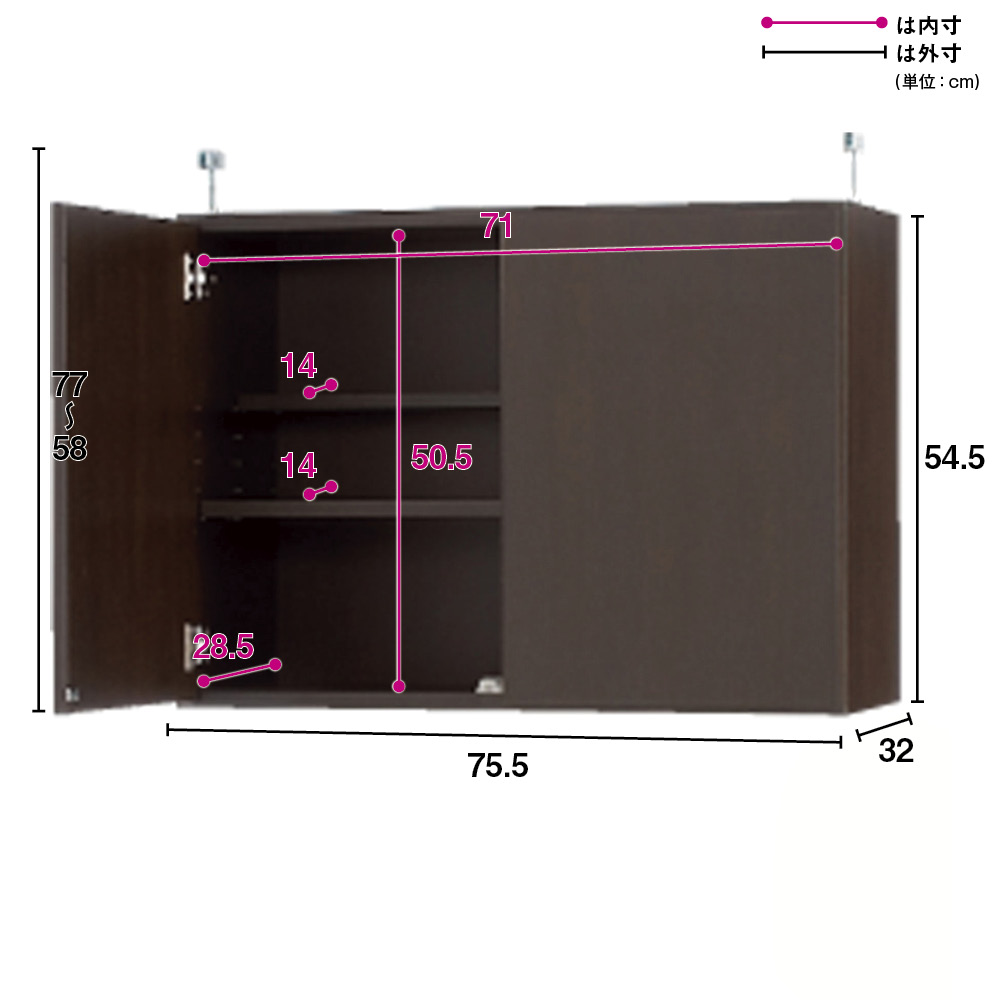 ■サイズ:幅75.5奥行32高さ54.5・重さ9kg、上置き設置時の天井対応高さ238~257cm