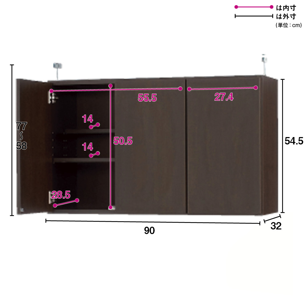 ■サイズ:幅90奥行32高さ54.5・重さ11kg、上置き設置時の天井対応高さ238~257cm