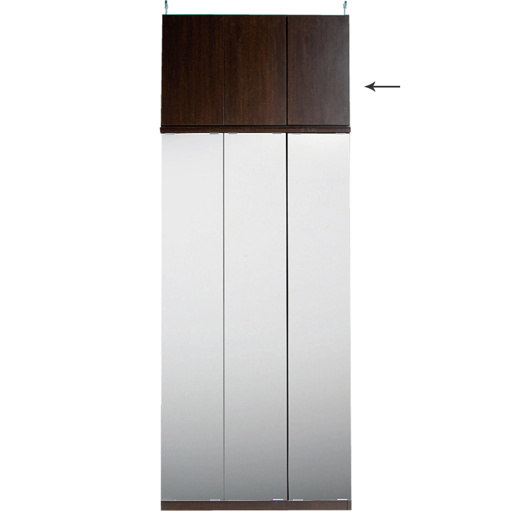 突っ張り上置きとの設置例 幅が同じサイズであれば、ミラー扉と板扉は組み合わせ可能です。写真はミラータイプの本体と板扉の上置きとの設置例です。