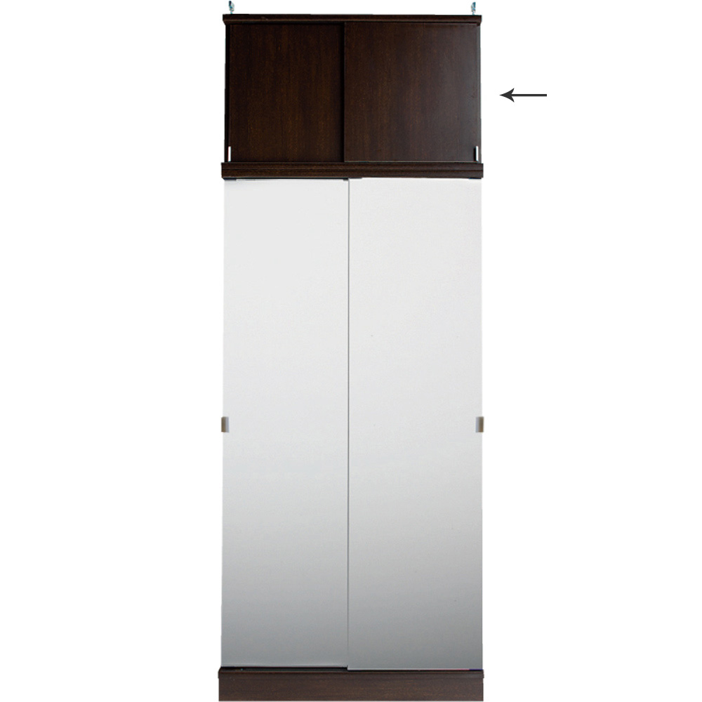 • 突っ張り上置きとの設置例 幅が同じサイズであれば、ミラー扉と板扉は組み合わせ可能です。写真はミラータイプの本体と板扉の上置きとの設置例です。